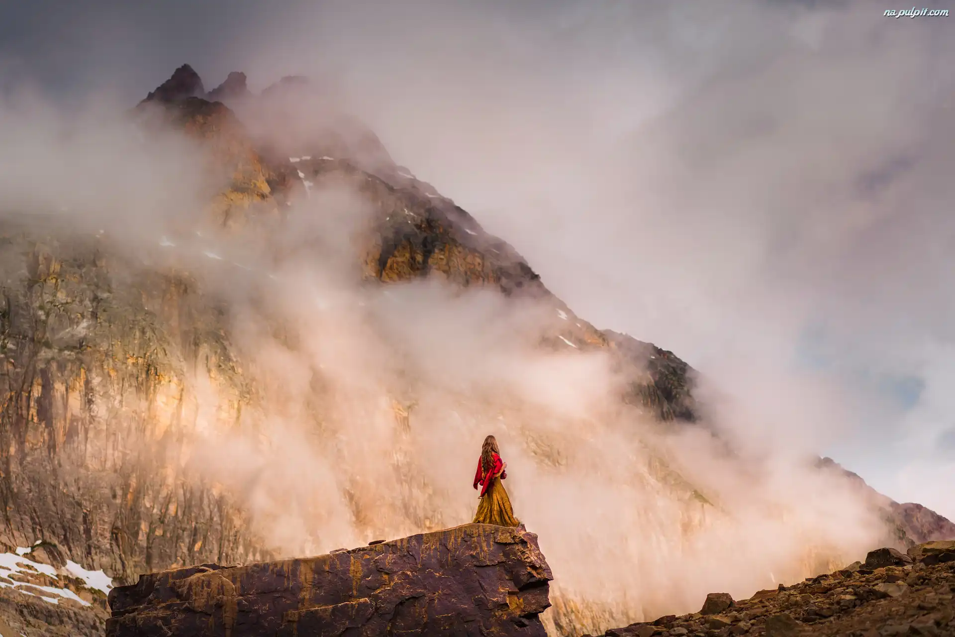 Kobieta, Mgła, Góry, Skała Na Pulpit