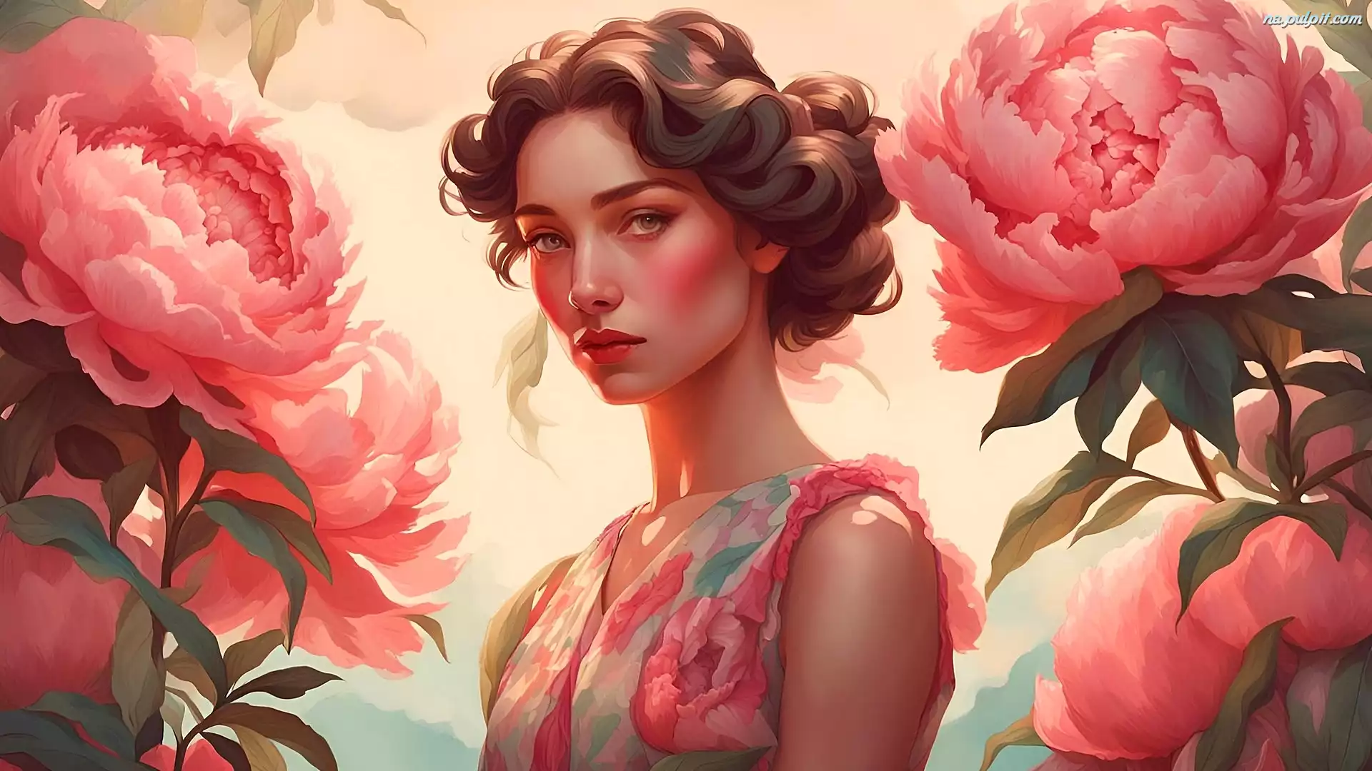 Piwonie, Kobieta, Kwiaty, Grafika, Czerwone