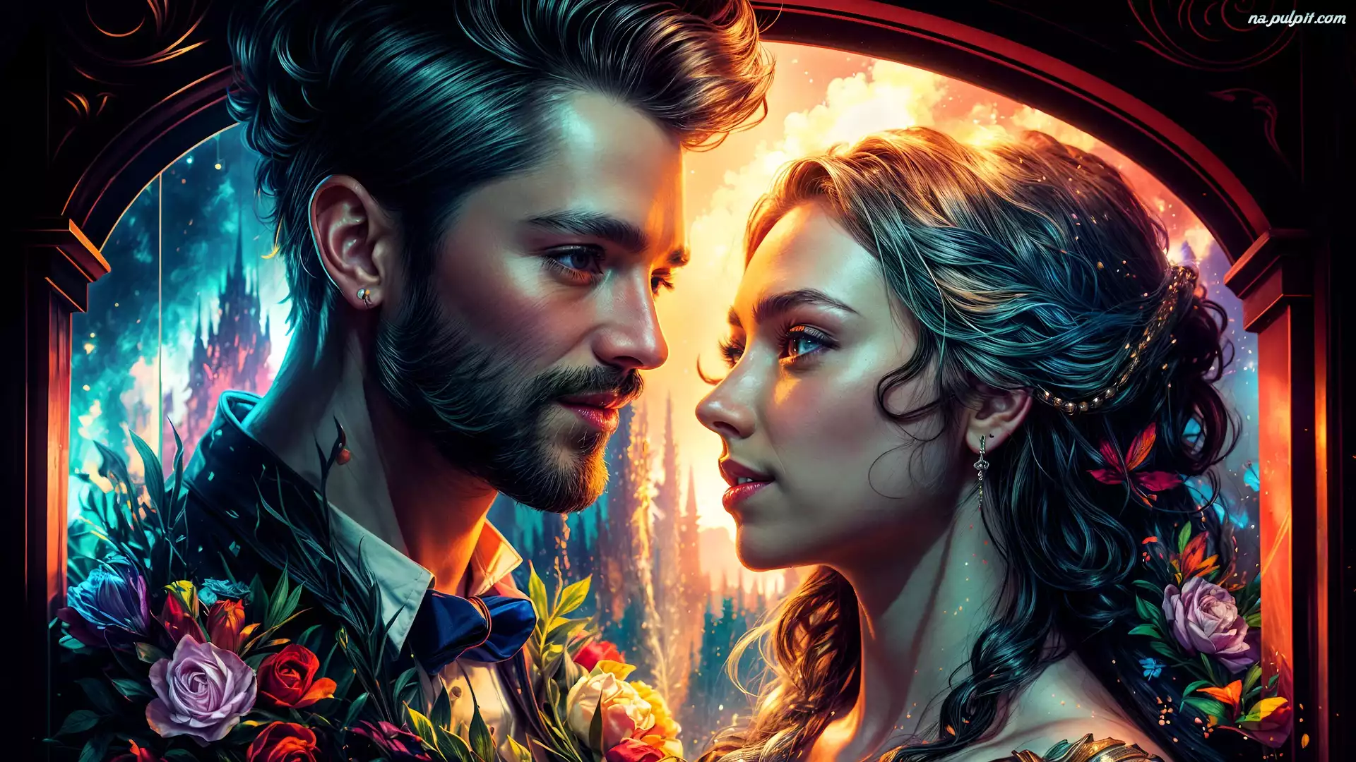 Zarost, Kobieta, Kwiaty, Grafika, Mężczyzna