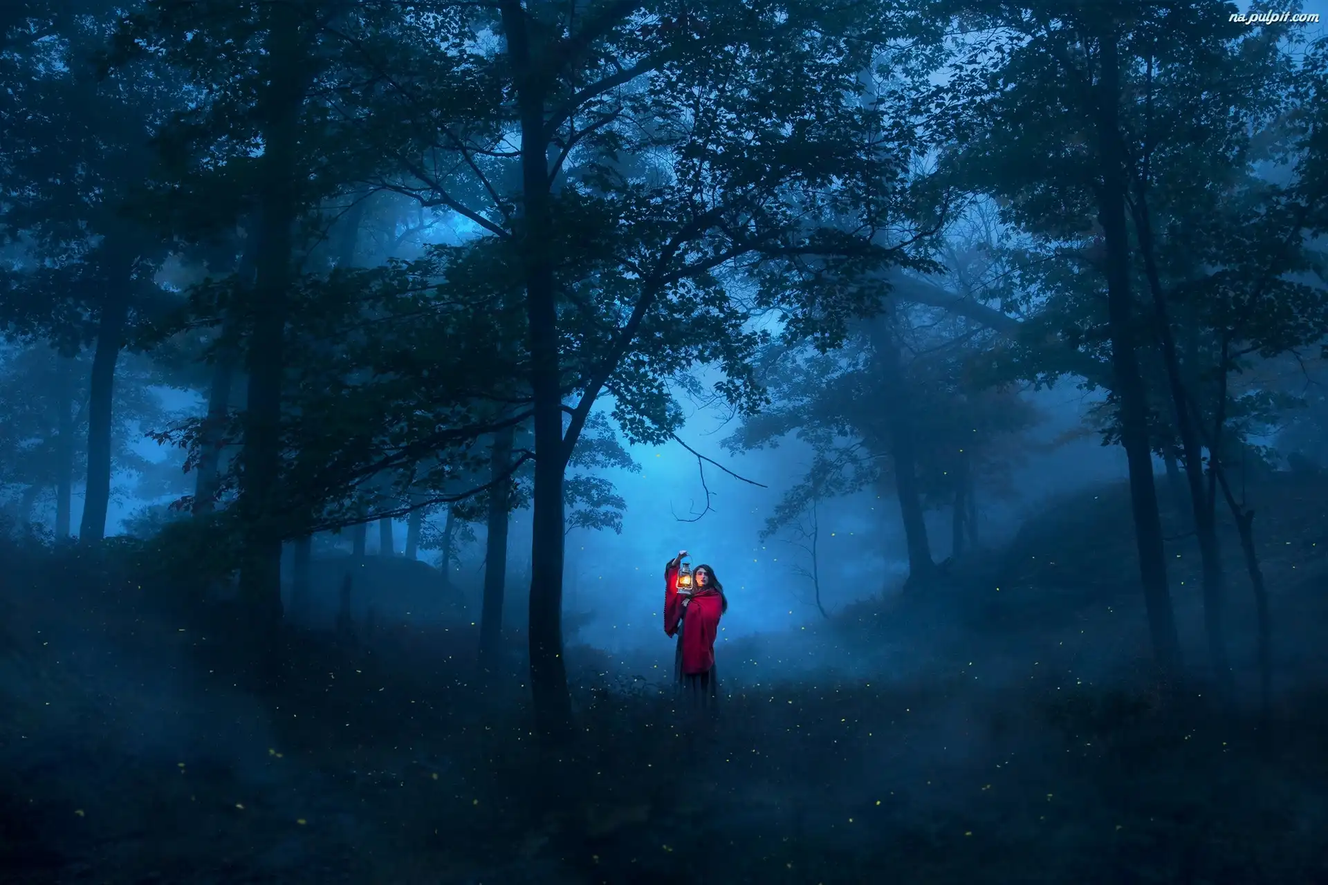 Kobieta, Mgła, Drzewa, Las, Lampa