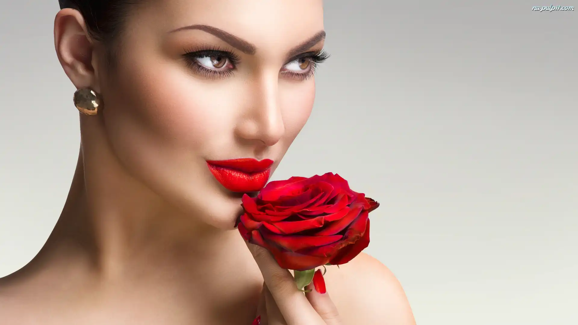 Czerwona, Kobieta, Makijaż, Róża, Kolczyki