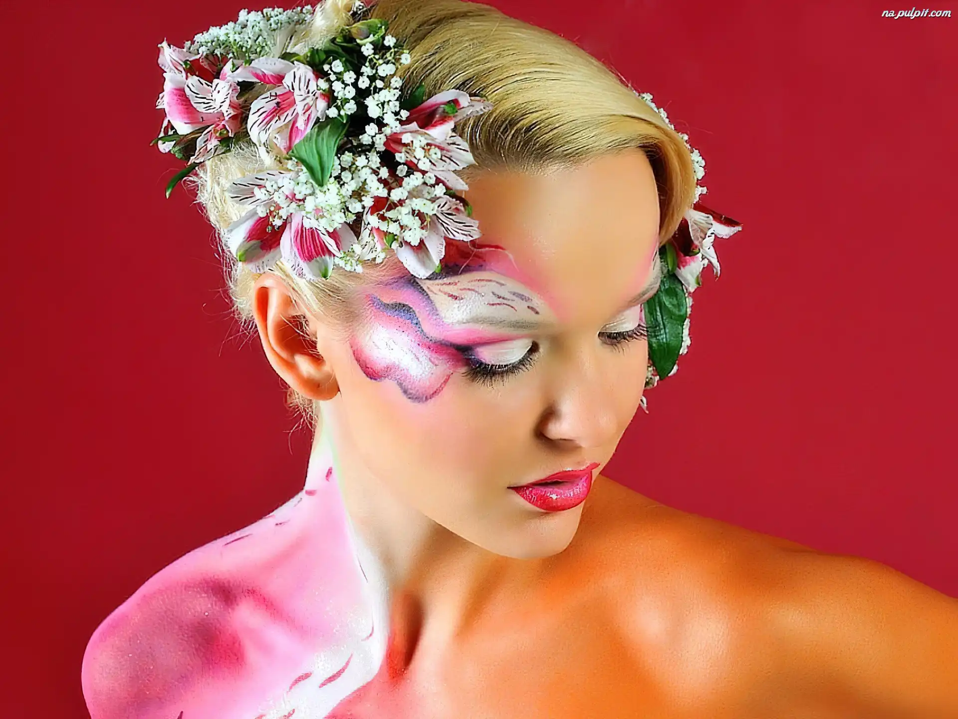Makijaż, Kobieta, Kwiaty Na Pulpit