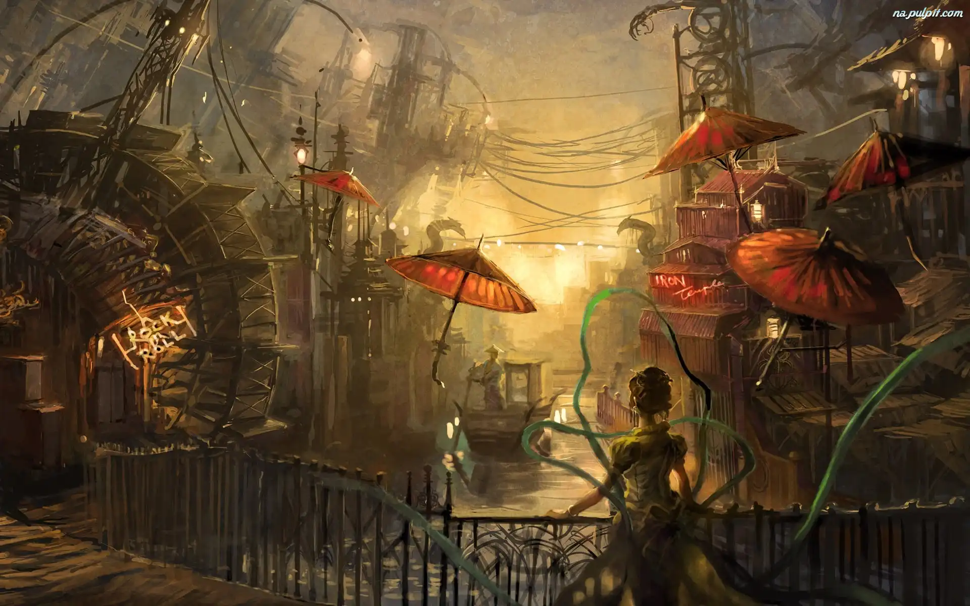 Fantasy, Parasolki, Gondola, Kobieta, Miasto Na Pulpit