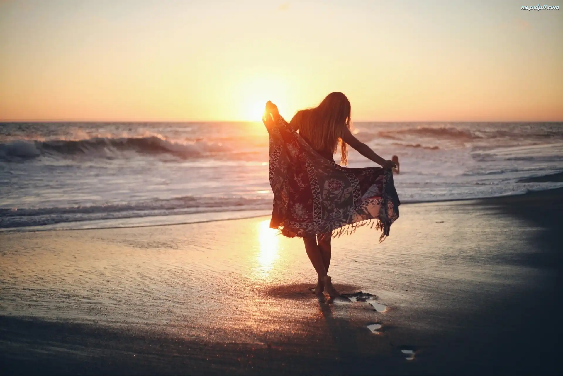 Kobieta, Zachód Słońca, Plaża, Morze, Lato