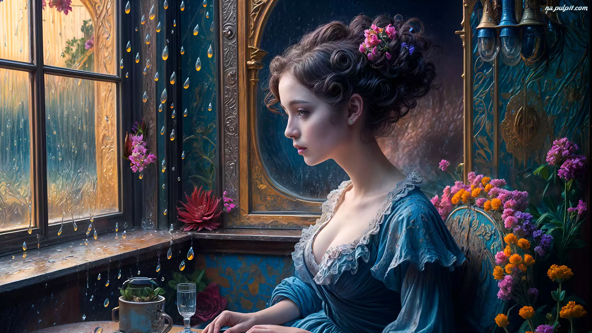 Kwiaty, Kobieta, Okno, Grafika, Deszcz Na Pulpit