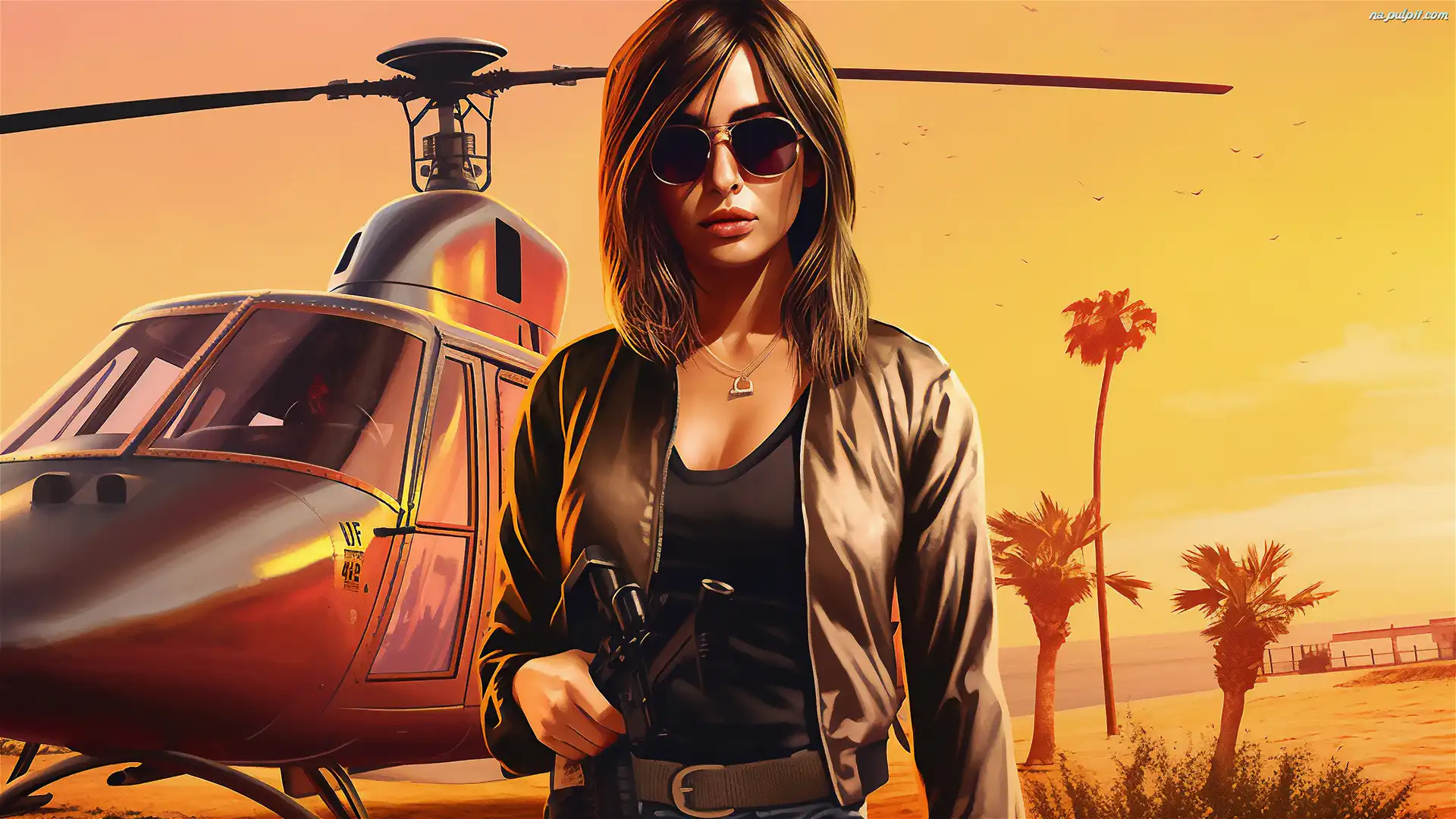 2D, Helikopter, Pasek, Kobieta, Kurtka, Okulary, Palmy