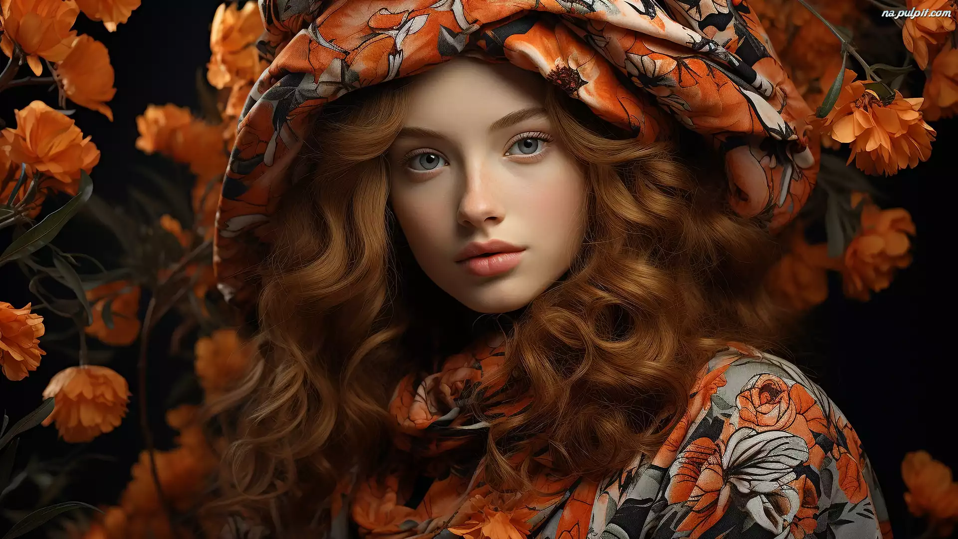 Spojrzenie, Kobieta, Rudowłosa, Kwiaty, Kaptur Na Pulpit