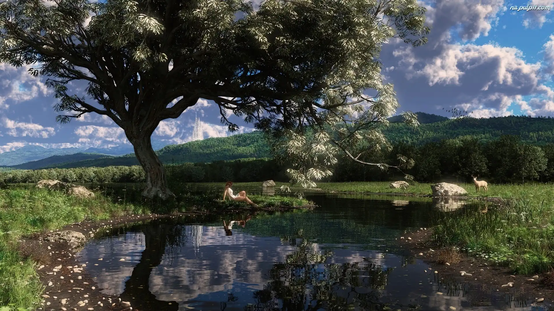 Kobieta, Drzewo, Rzeczka, Zieleń Na Pulpit