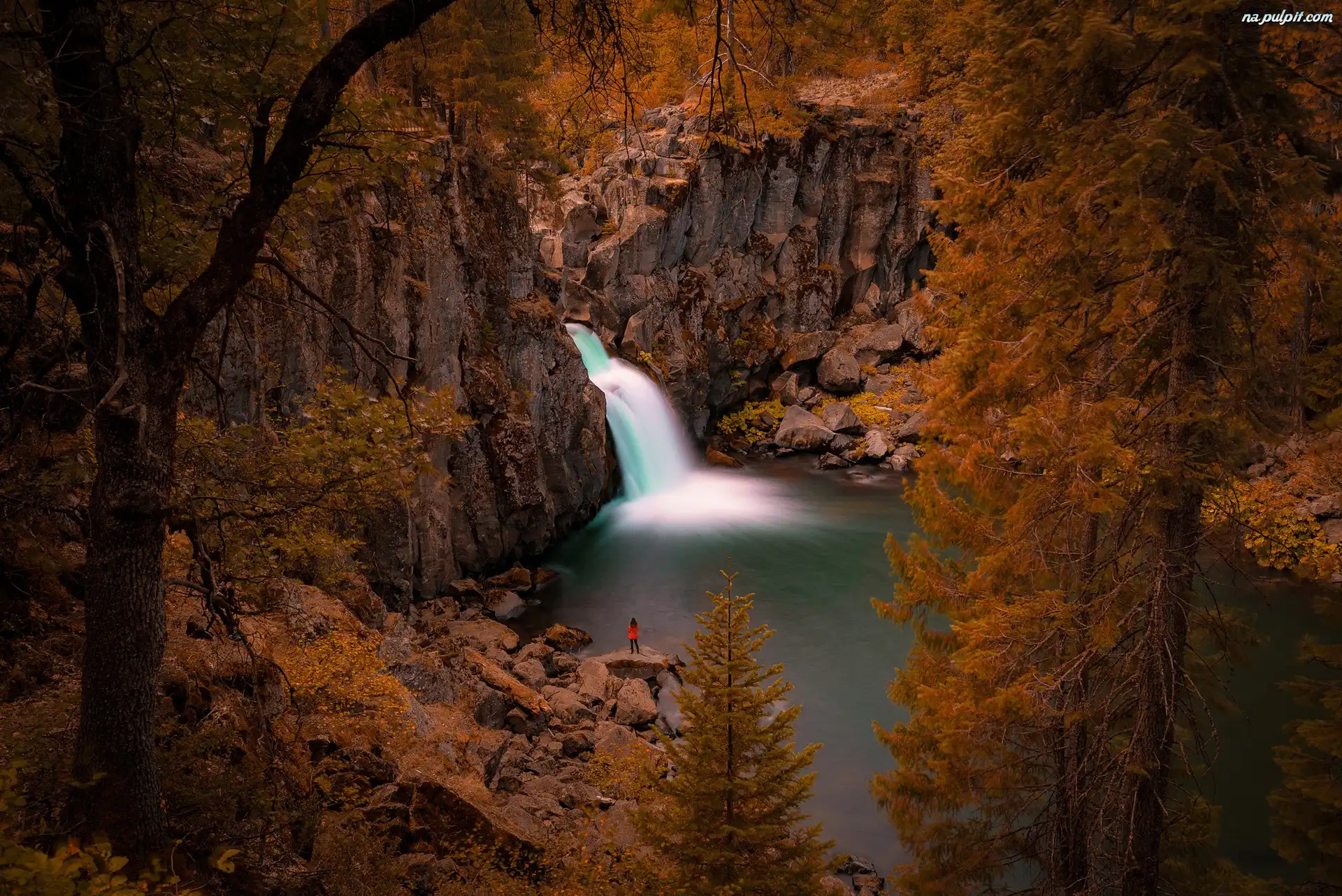 Kobieta, Drzewa, Wodospad, Skały, Jesień Na Pulpit