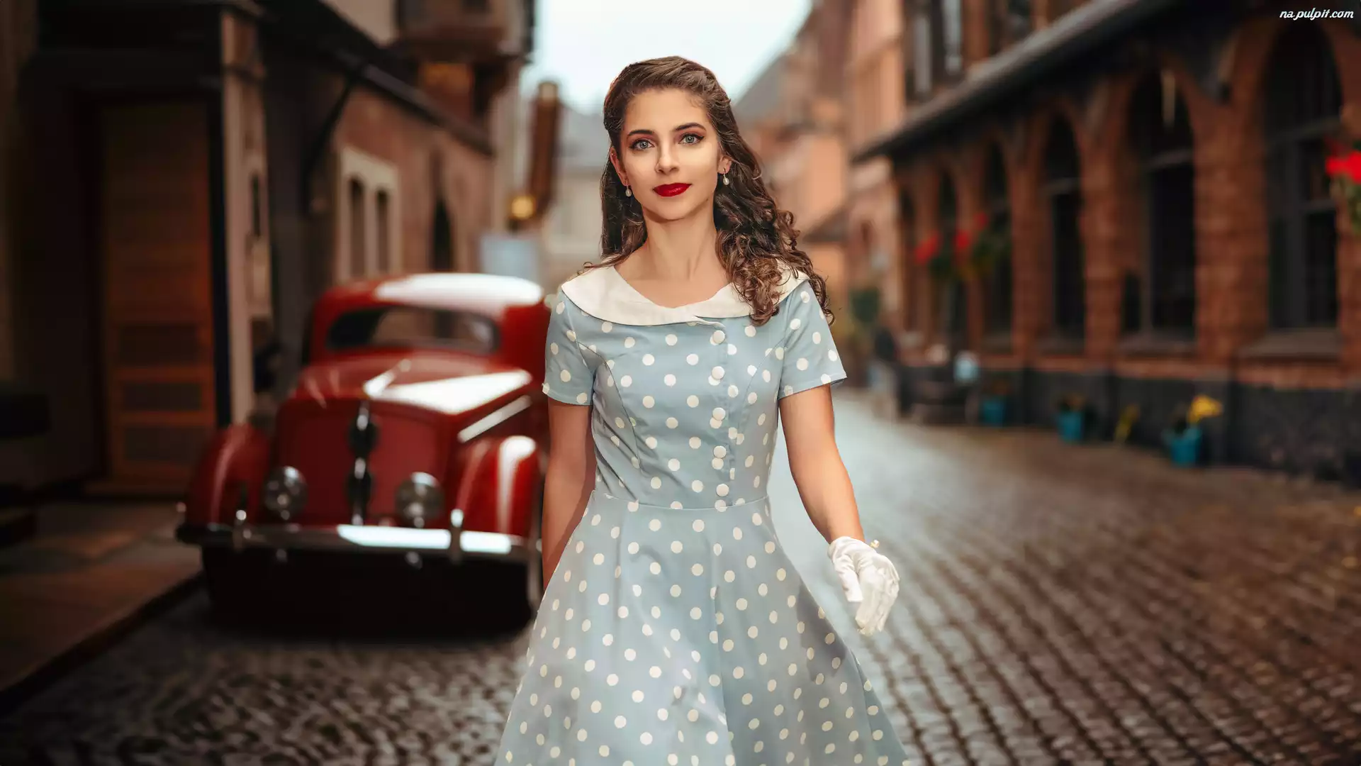 Ulica, Kobieta, Sukienka, Domy, Rękawiczki