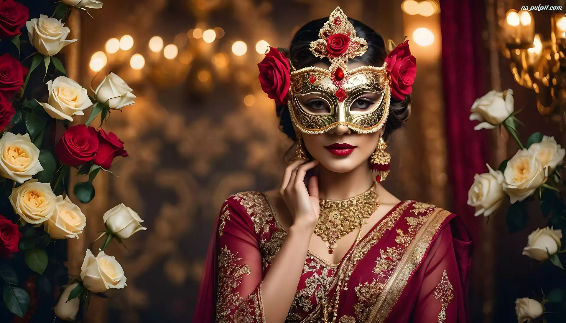 Maska karnawałowa, Róże, Kobieta, Bizuteria, Suknia Na Pulpit
