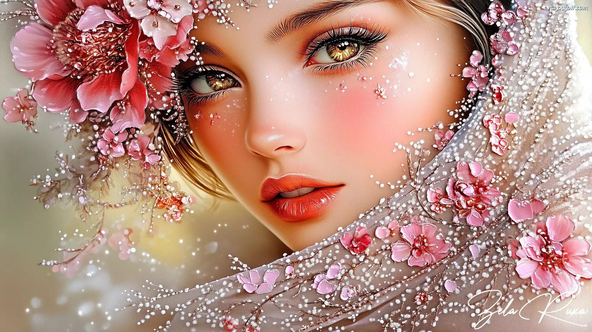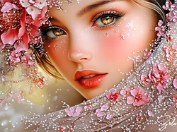 Kwiaty, Kobieta, Twarz, Grafika, Spojrzenie