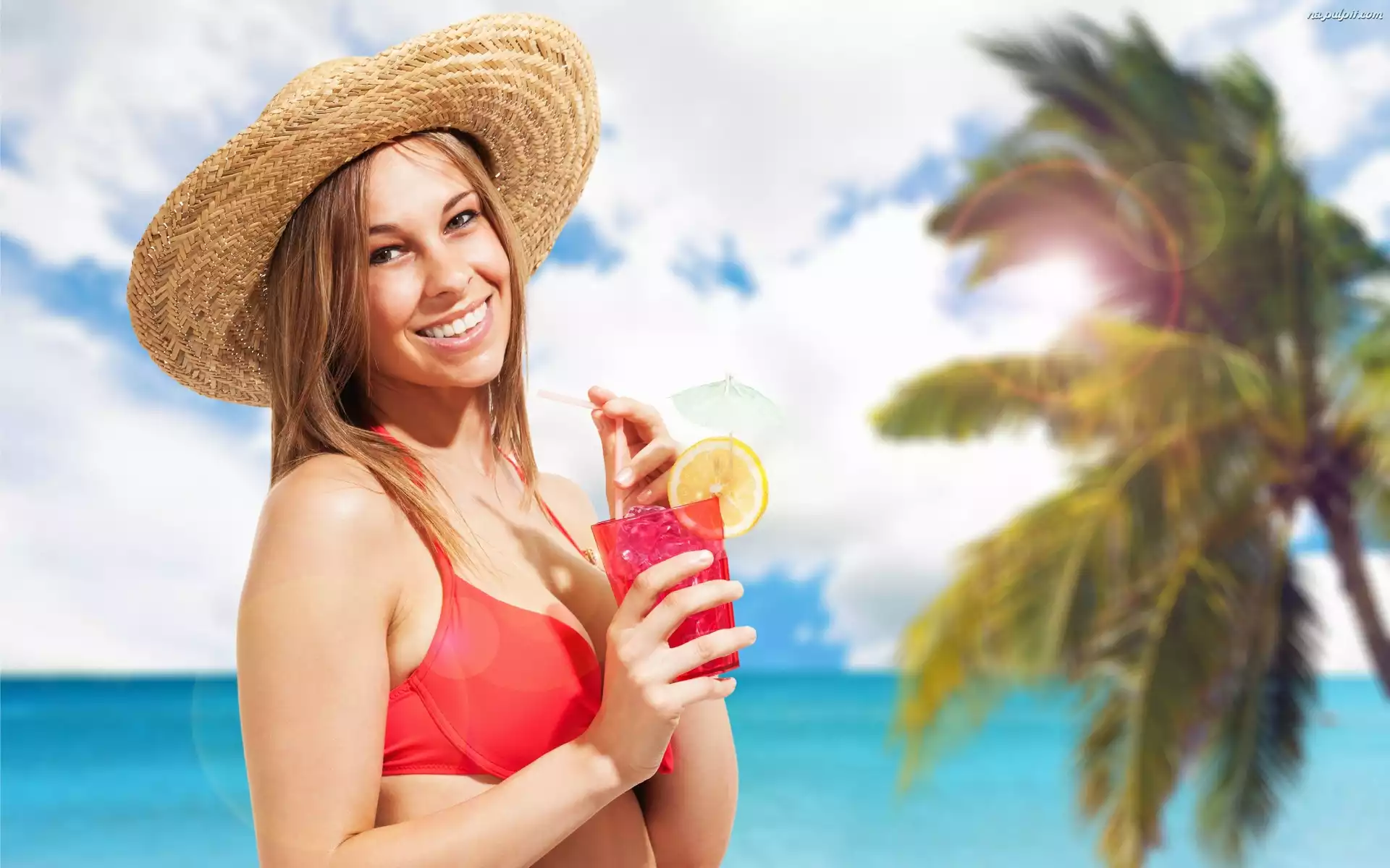 Kobieta, Koktajl, Kapelusz, Plaża, Uśmiechnięta, Palmy