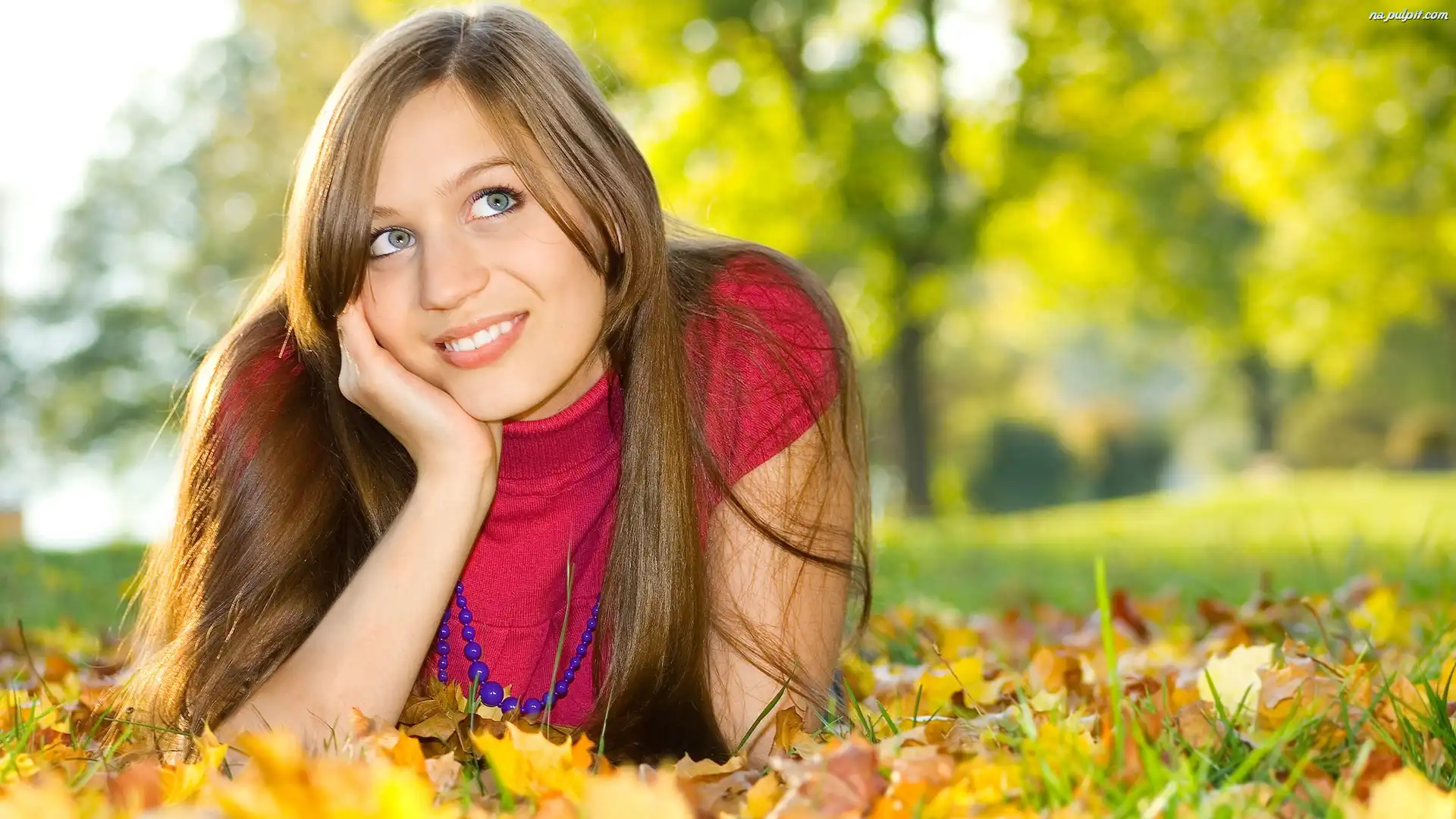 Kobieta, Liście, Trawa, Czerwona, Uśmiechnięta, Bluzka Na Pulpit