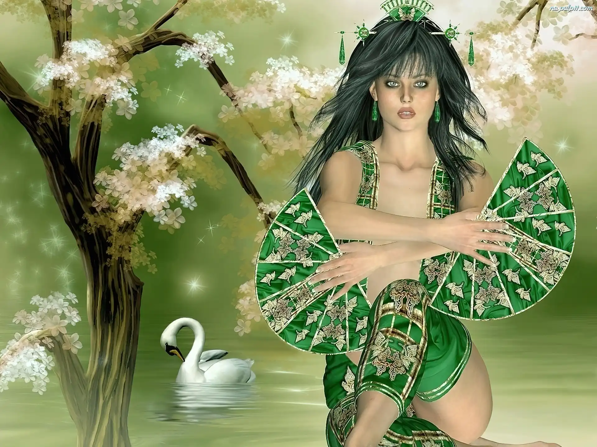 Łabędź, Wachlarze, Kobieta, Woda Na Pulpit