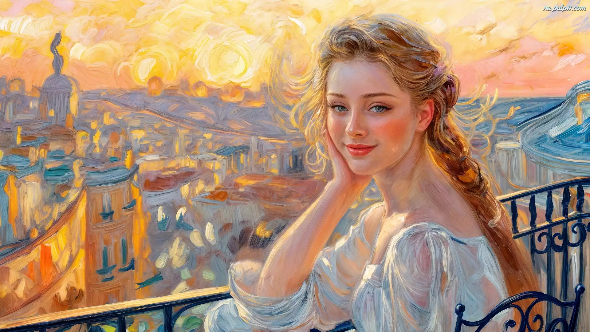 Miasto, Kobieta, Warkocz, Grafika, Balkon