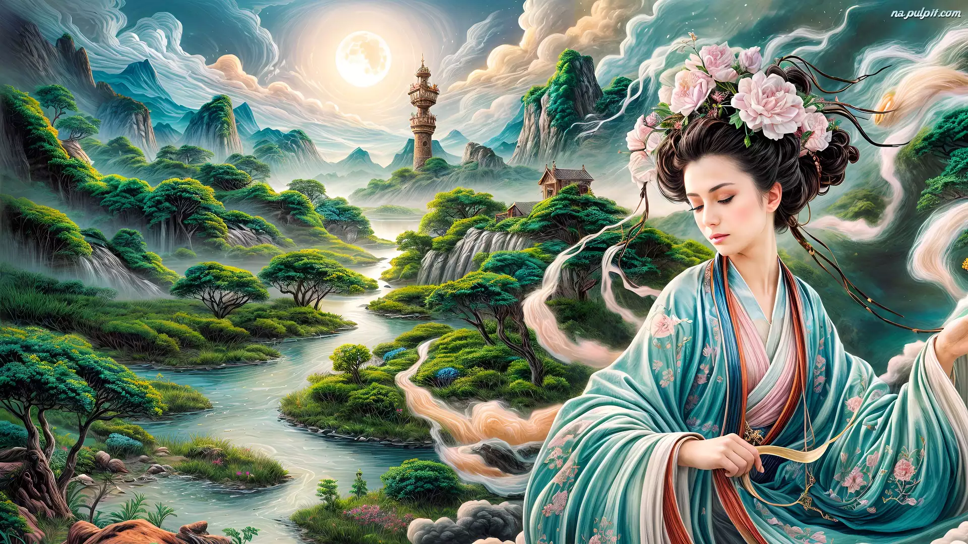 Drzewa, Kobieta, Wodospad, Grafika, Rzeka