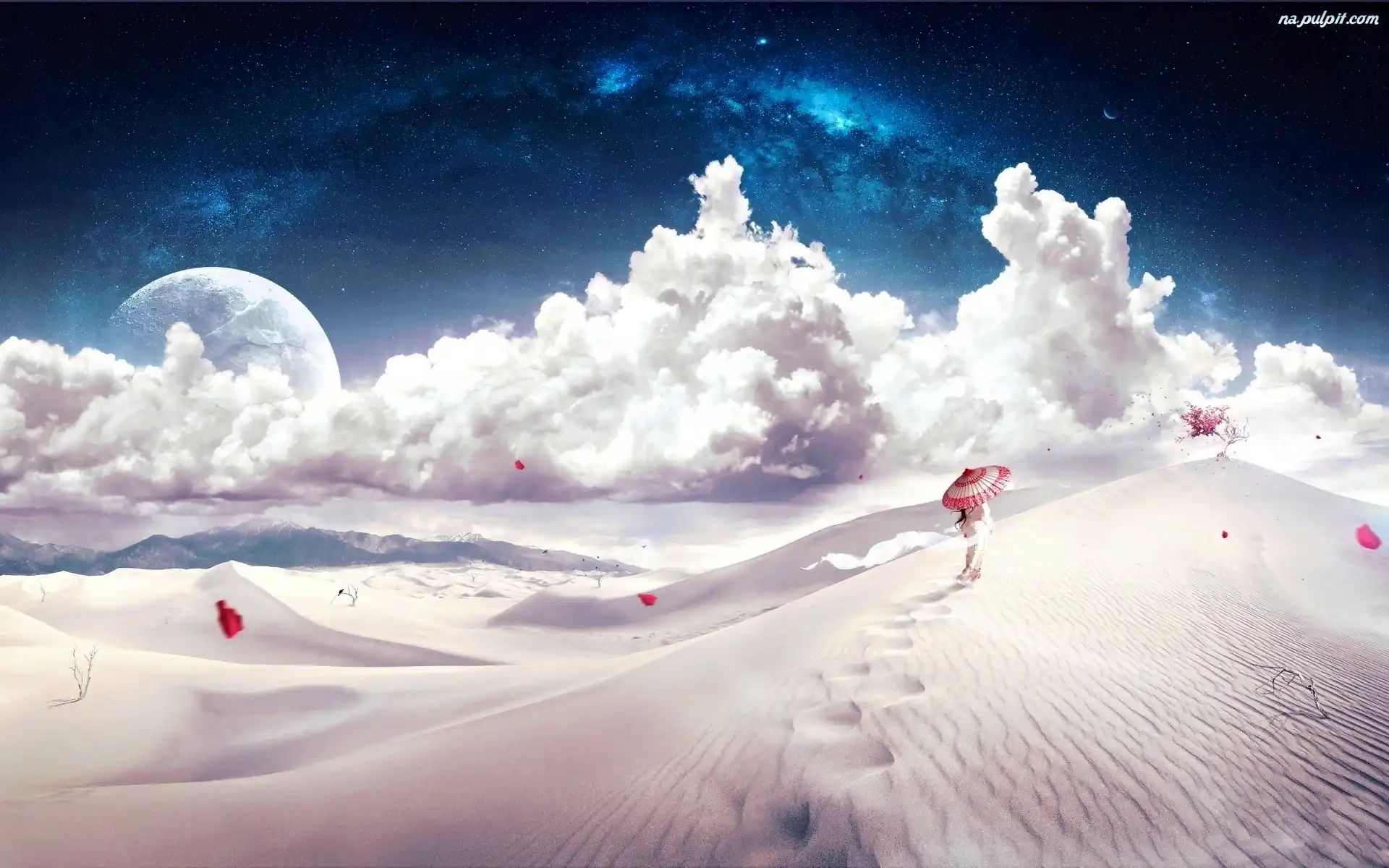 Pustynia, Kobieta, Japonka, Chmury, Księżyc, Parasolka, fantasy, Wydmy Na Pulpit