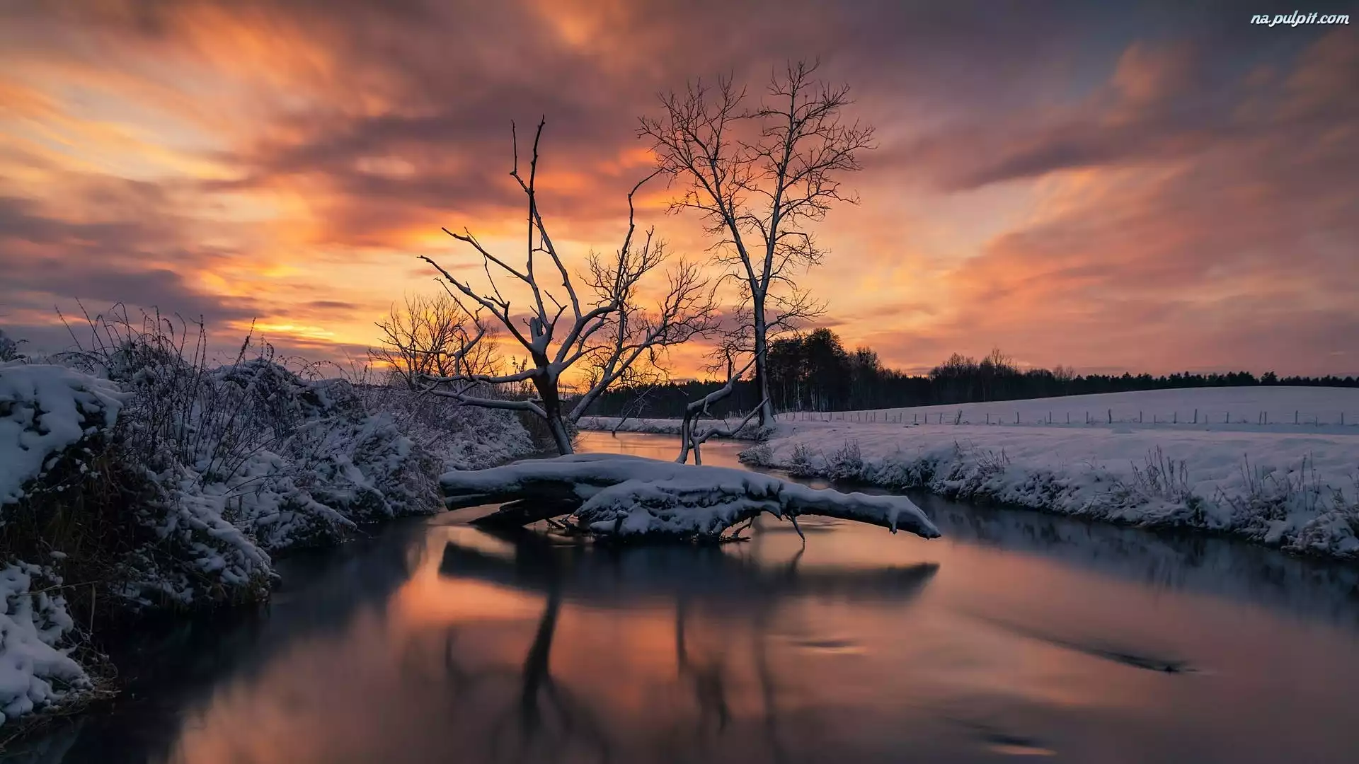 Kociewie, Polska, Zachód słońca, Wierzyca, Drzewa, Rzeka, Zima, Szuwary, Ośnieżone Na Pulpit