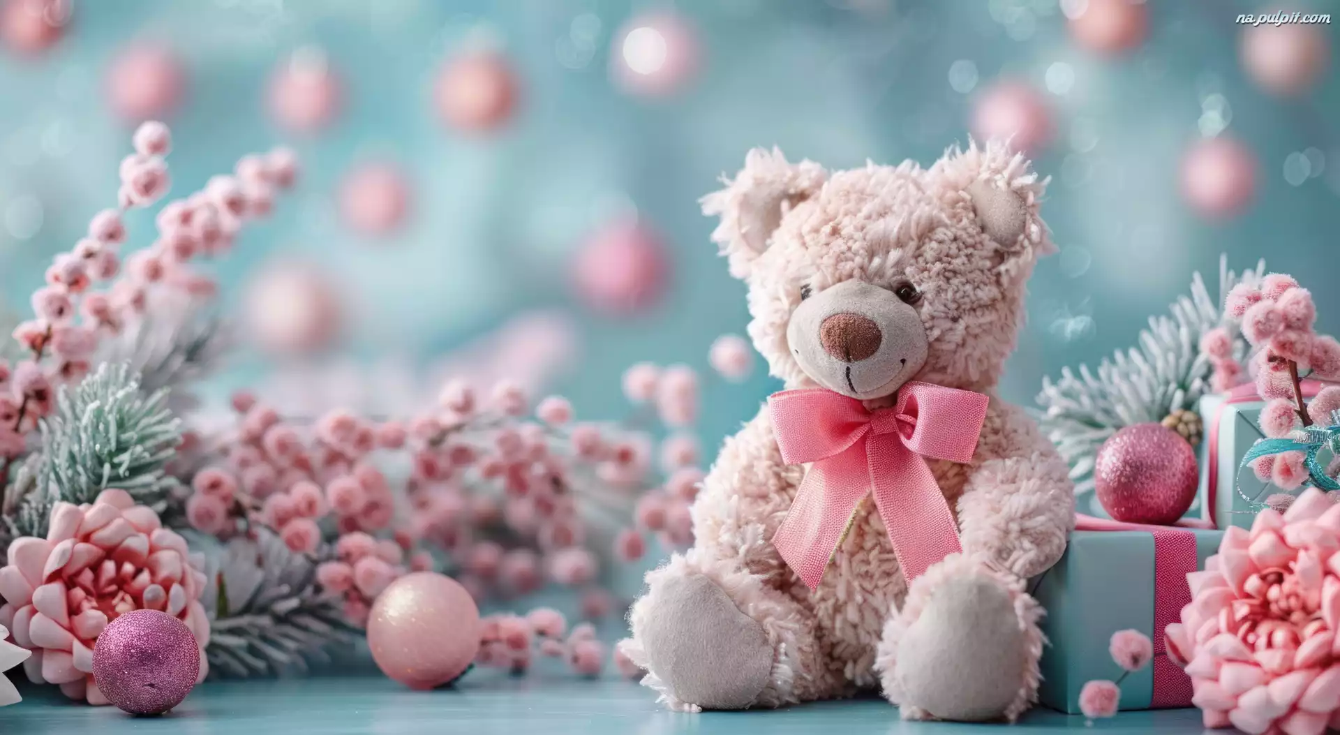 Prezent, Różowa, Bombki, Zabawka, Gałązki, Kwiaty, Miś, Kokarda