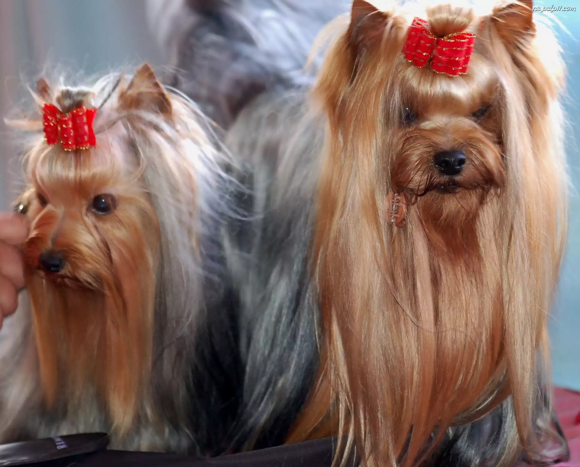 kokardki, Yorkshire Terriery, dwa, czerwone Na Pulpit