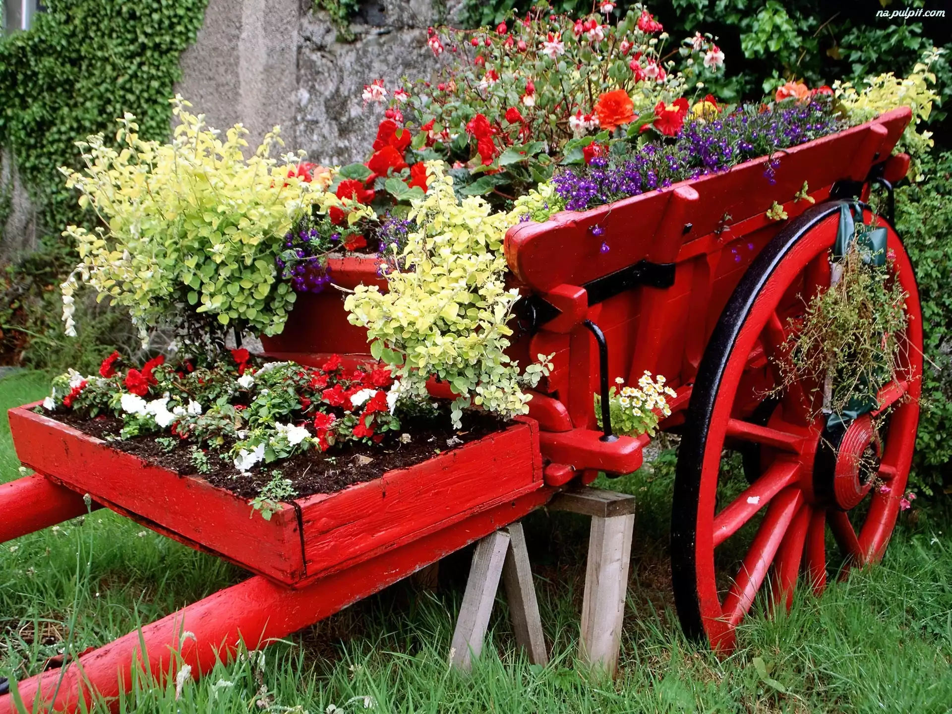 Koło, Kwiaty, Wóz, Kwietnik, Czerwone