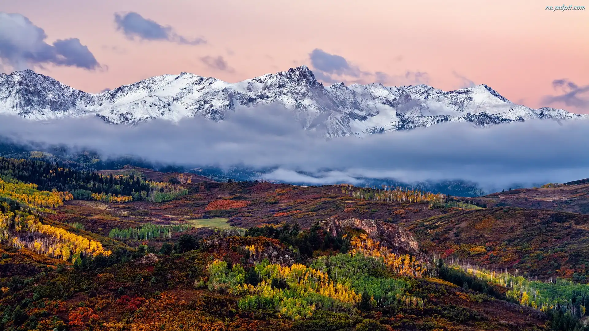 Szczyt, Jesień, Drzewa, Góry Skaliste, Mgła, Stany Zjednoczone, Kolorado, Mount Sneffels, Chmury, Lasy, Pożółkłe Na Pulpit |