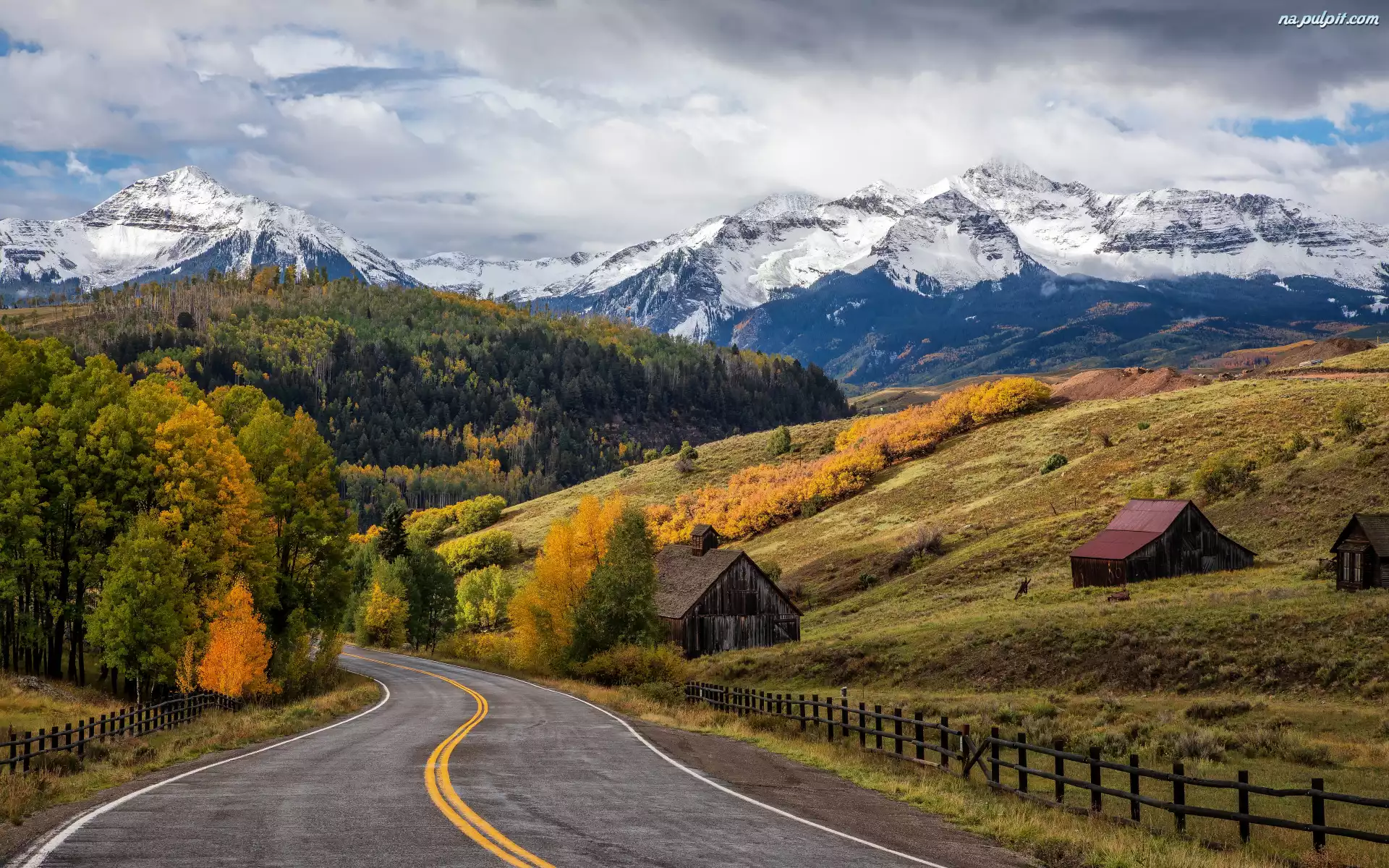 Droga, Chmury, Góry, Ogrodzenie, Wilson Peak, Drzewa, Kolorado, Jesień, Pola, Domki, Stany Zjednoczone, Telluride, Wzgórza Na Pulpit |