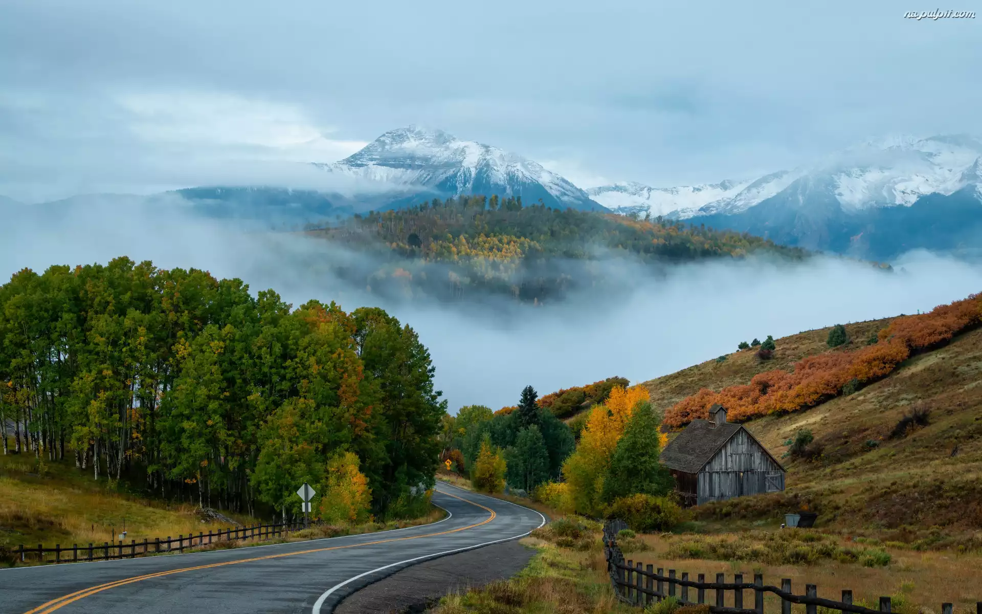 San Juan Mountains, Stany Zjednoczone, Ogrodzenie, Mgła, Dom, Kolorado, Telluride, Góry, Niebo, Droga, Drzewa Na Pulpit |