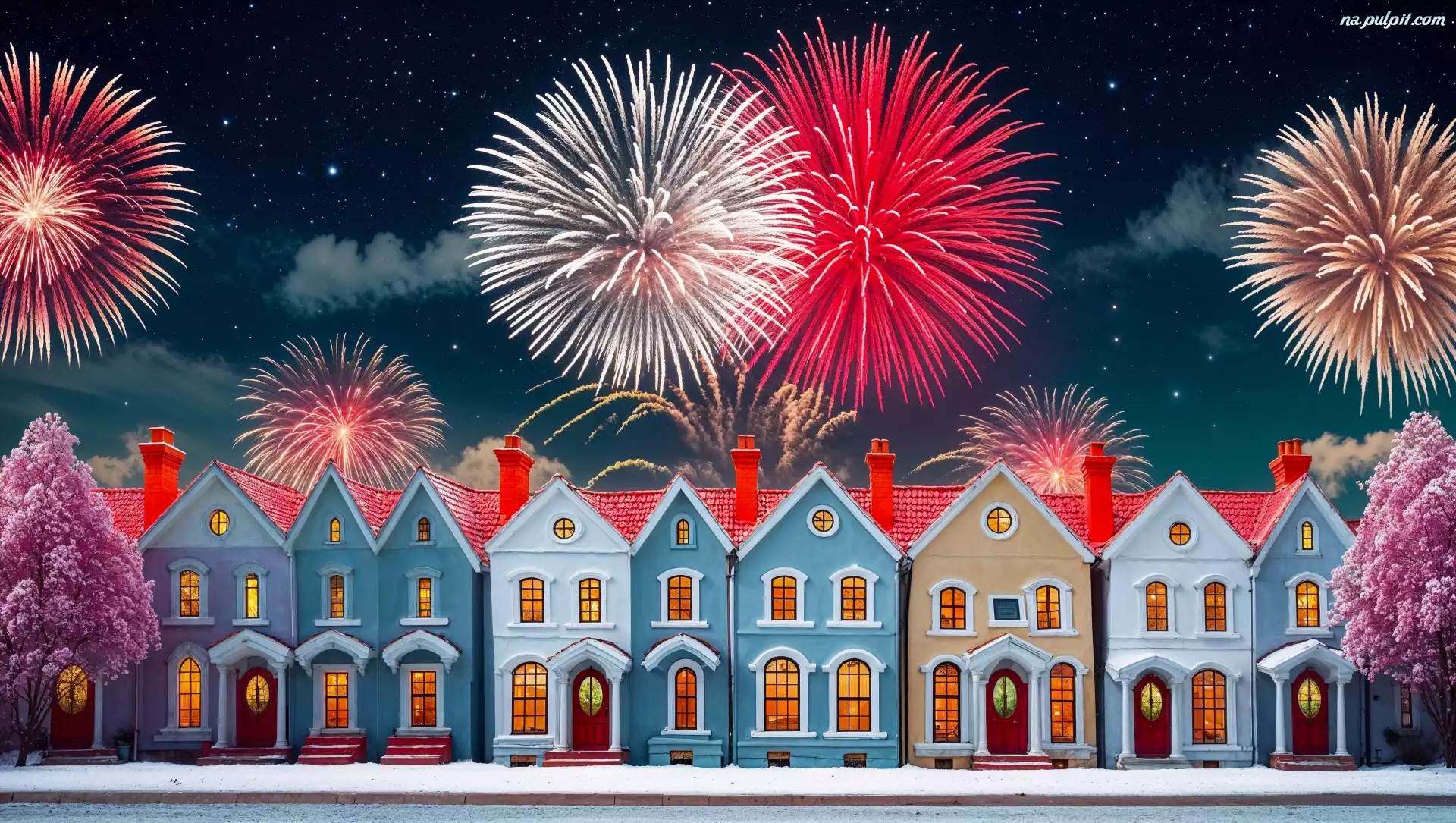 Fajerwerki, Kolorowe, Domy, Grafika, Sylwester Na Pulpit