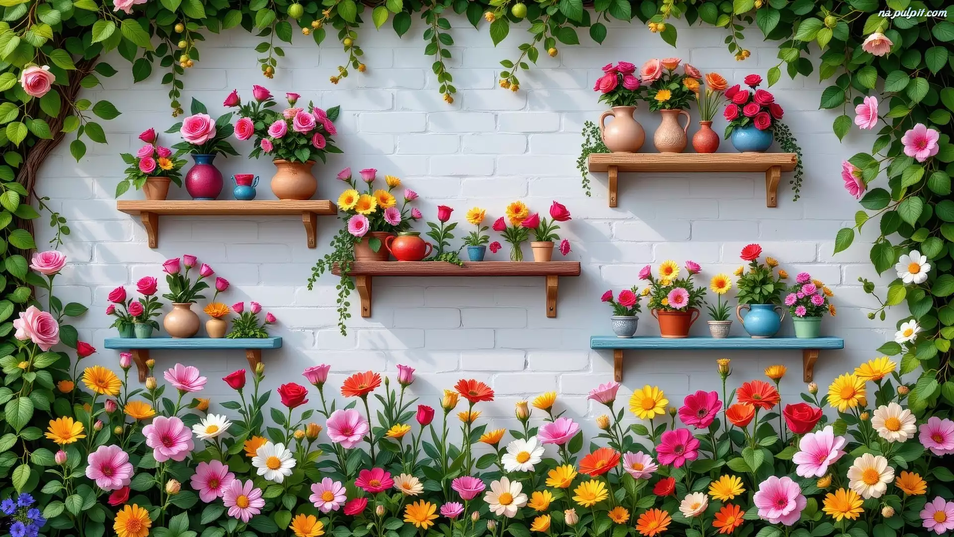 Kwiaty, Murowana, Półki, Kolorowe, Ściana, Doniczki Na Pulpit