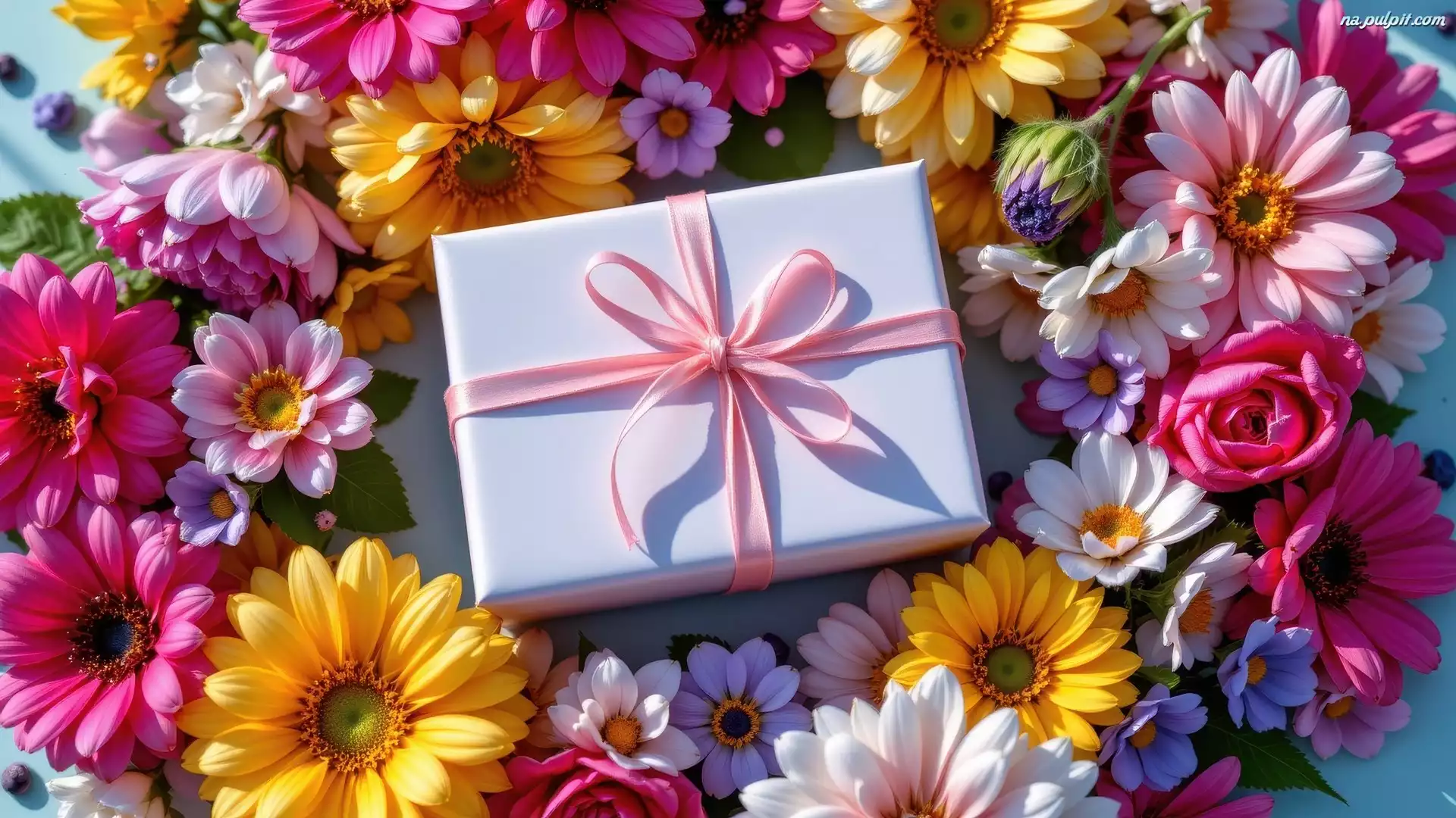 Kwiaty, Prezent, Wstążka, Kolorowe, Różowa, Gerbery Na Pulpit