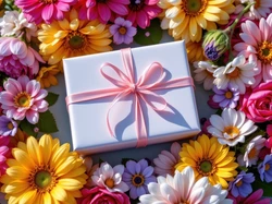 Kwiaty, Prezent, Wstążka, Kolorowe, Różowa, Gerbery