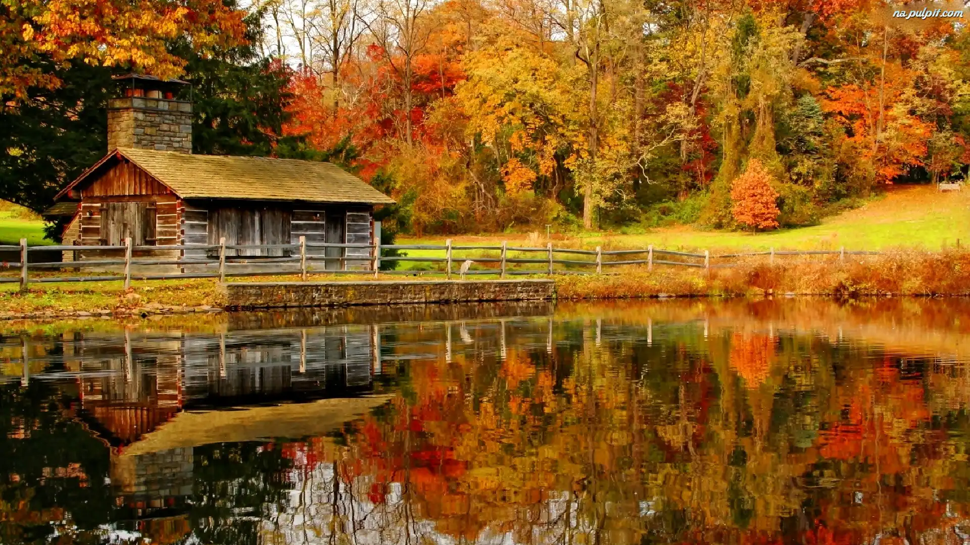 Kolorowe, Budynek, Odbicie, Liście, Las, Staw Na Pulpit