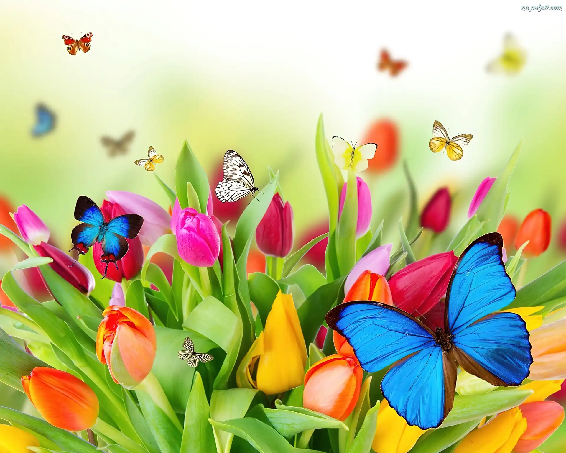 Motyle, Kolorowe, Tulipany Na Pulpit