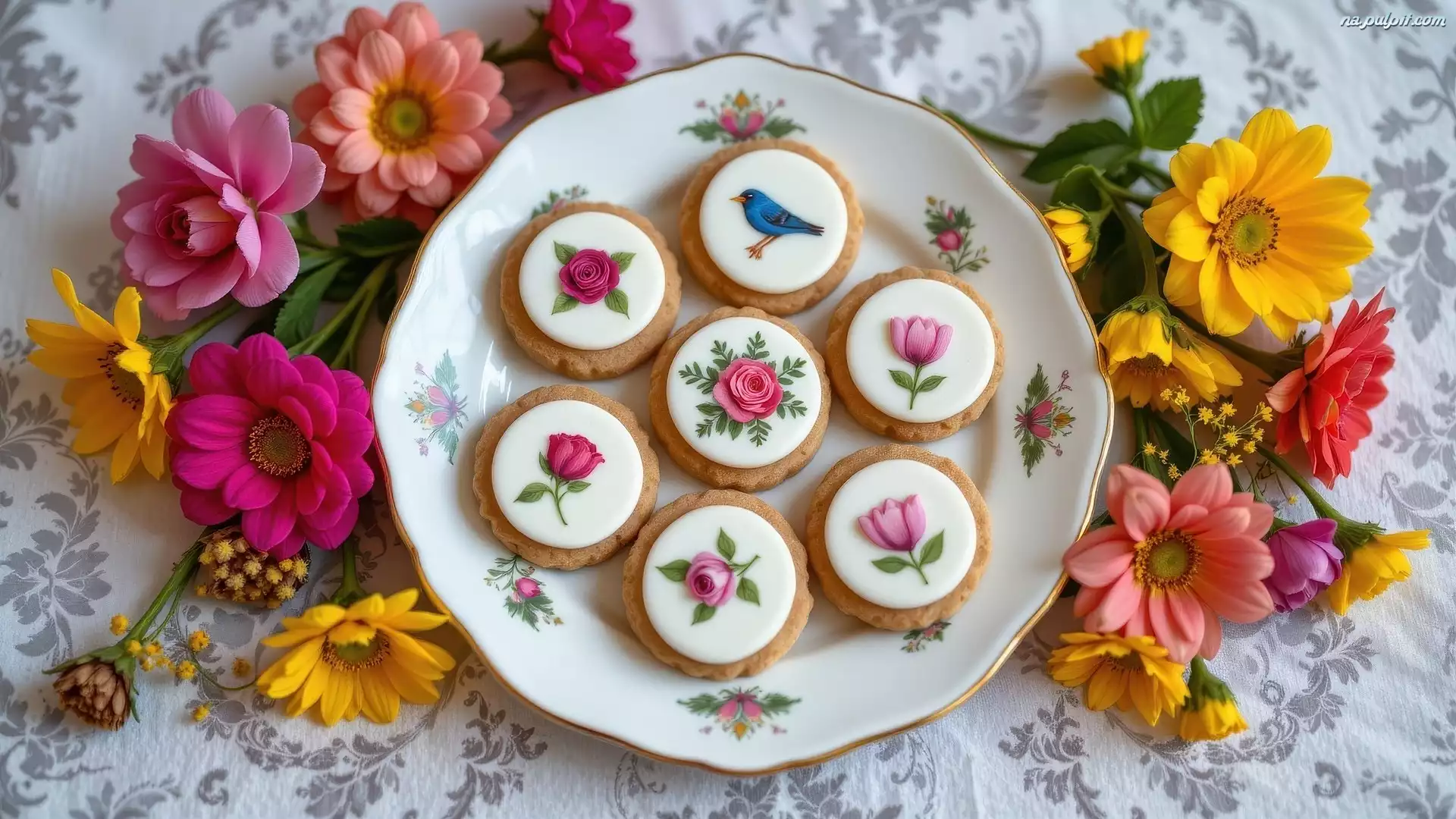 Kwiaty, Udekorowane, Talerz, Kolorowe, Ciastka, Obrus Na Pulpit