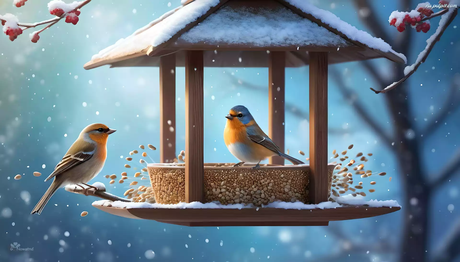 Zima, Kolorowe, Ptaki, Grafika, Karmnik Na Pulpit