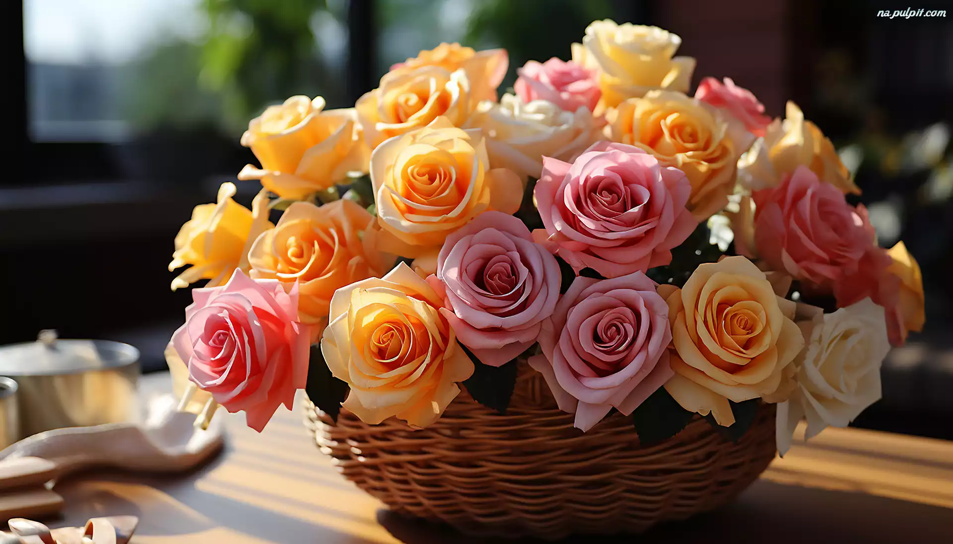 Różowe, Kolorowe, Róże, Koszyk, Żółte Na Pulpit