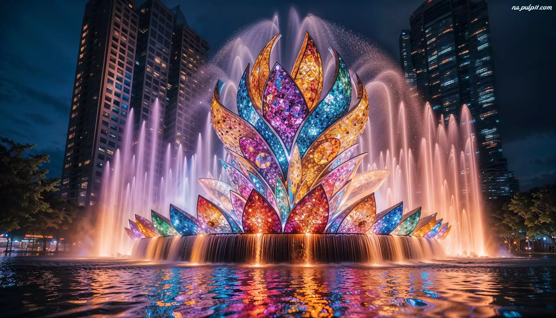 Wieżowce, Grafika, Światła, Kolorowe, Fontanna, Woda Na Pulpit