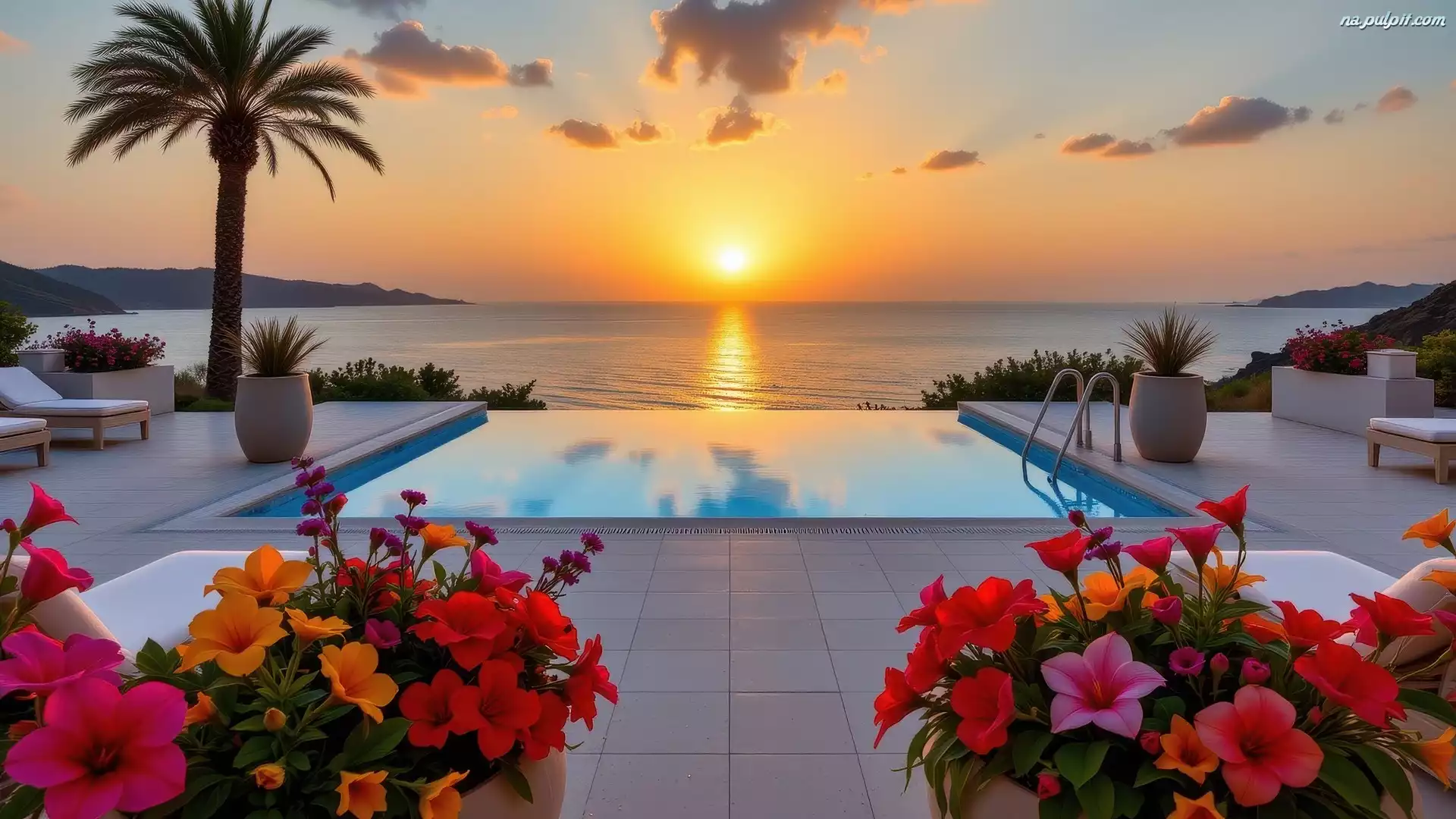 Kolorowe, Basen, Kwiaty, Morze, Leżaki, Donice, Zachód słońca, Palma Na Pulpit