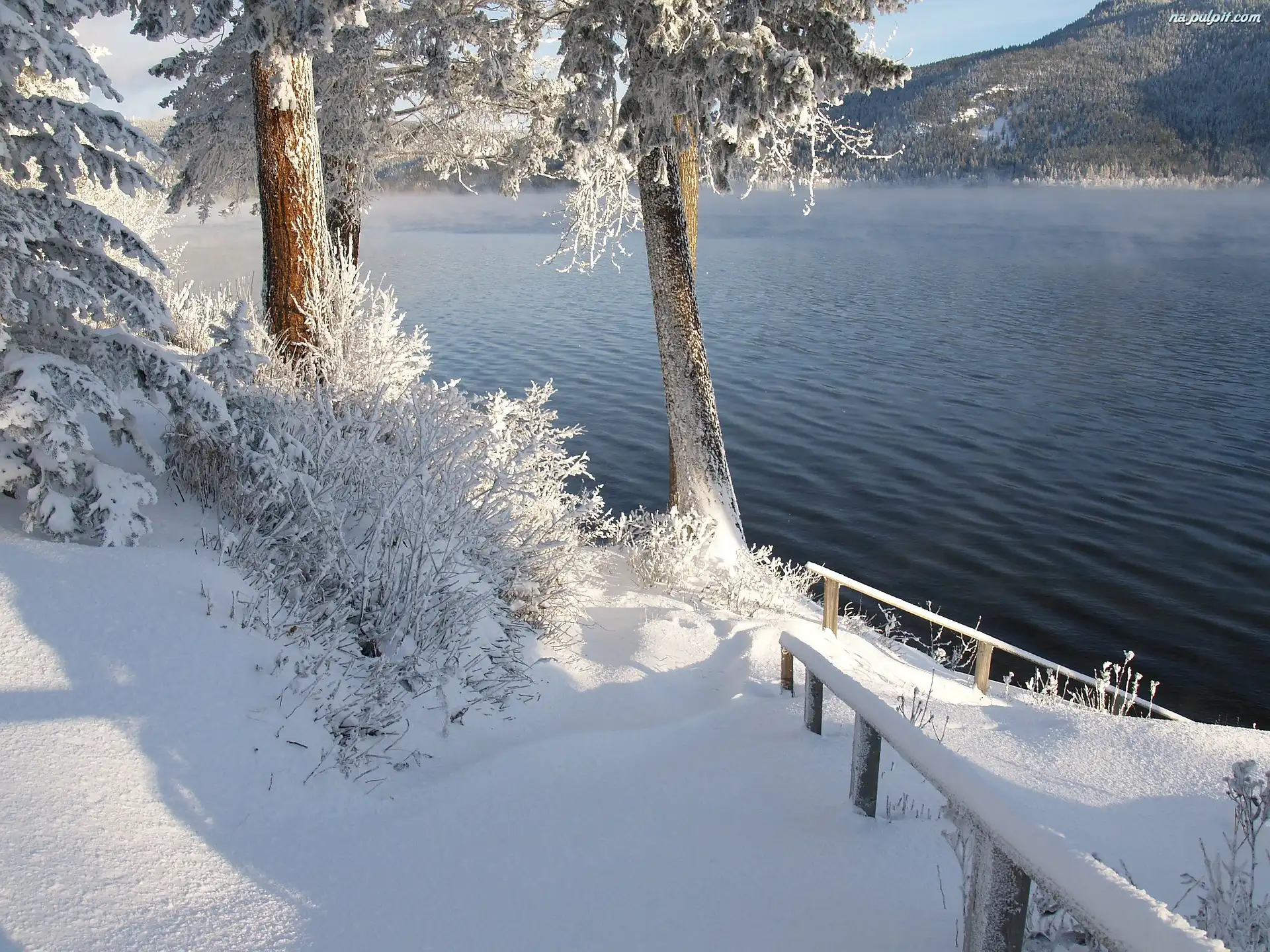 Canim Lake, Śnieg, Drzewa, Szron, Kolumbia Brytyjska, Kanada, Pogodny dzień, Zima, Jezioro Na Pulpit |