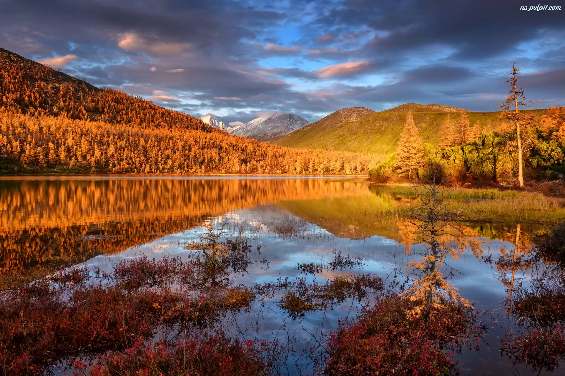 Kołyma, Rosja, Jezioro, Pożółkłe, Drzewa, Las, Góry, Jesień, Chmury Na Pulpit