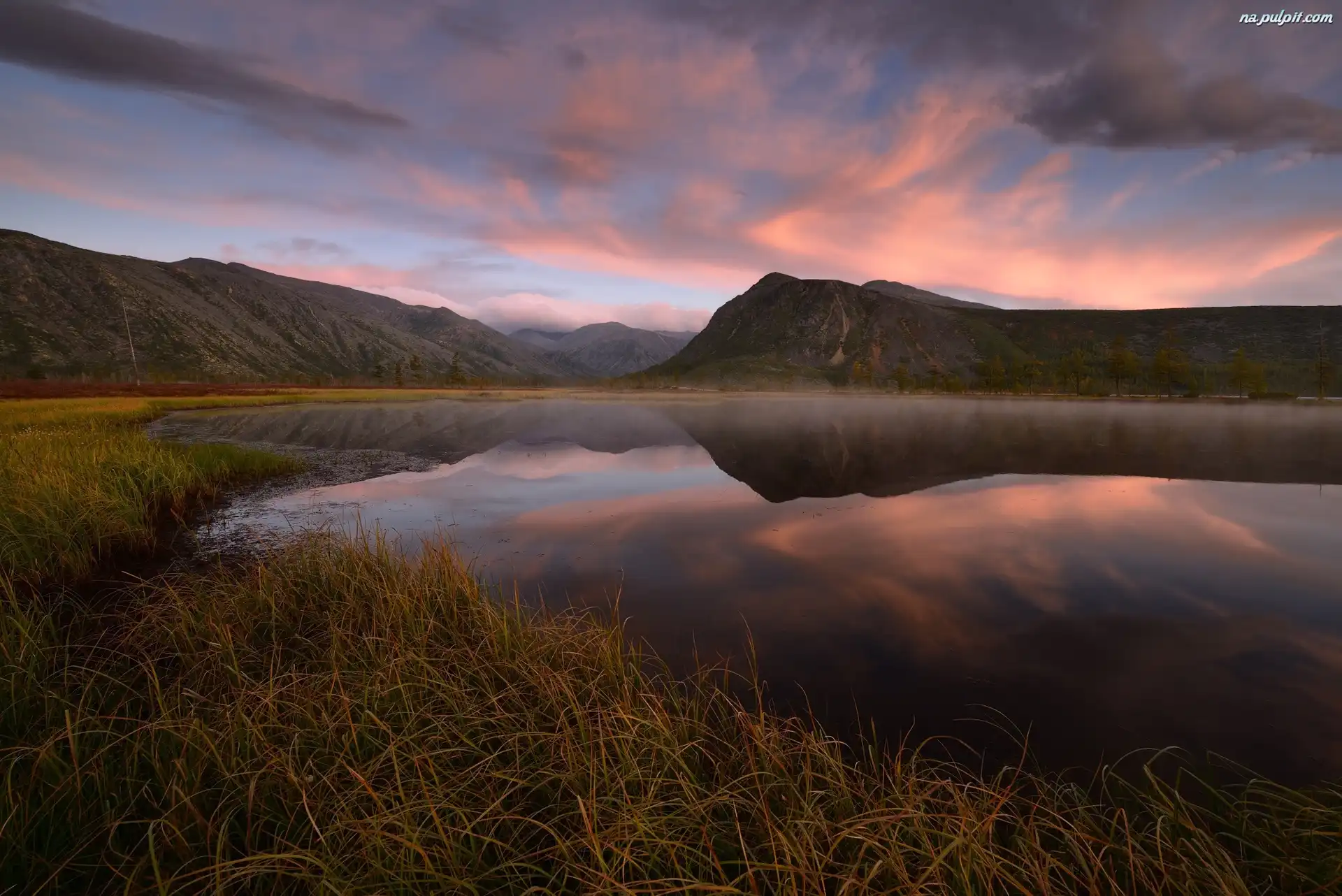 Kołyma, Trawa, Jezioro Jack London, Wschód słońca, Obwód magadański, Rosja, Chmury, Góry, Odbicie Na Pulpit |