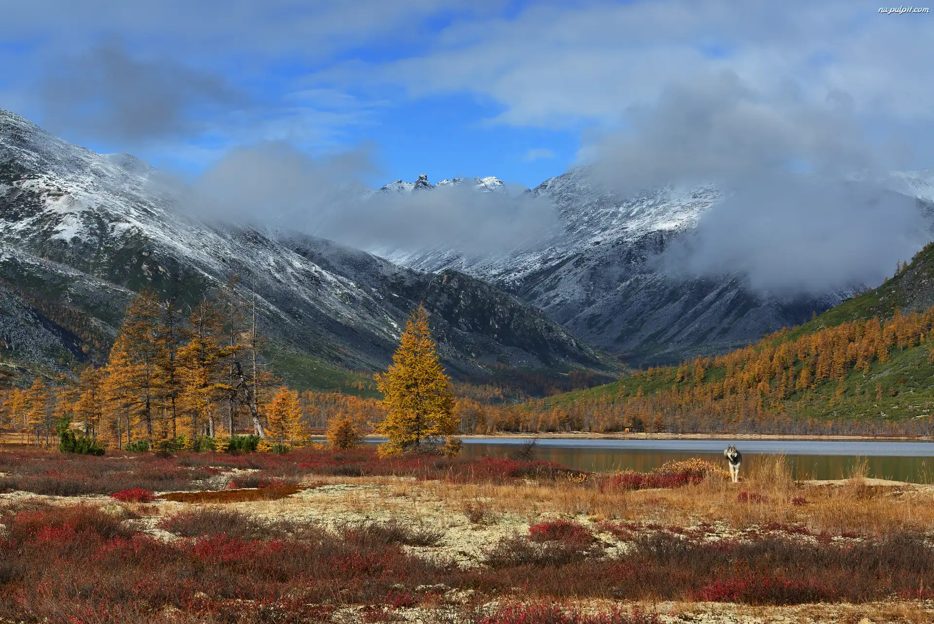 Kołyma, Góry Kołymskie, Mgła, Pies, Magadan, Rosja, Drzewa, Jesień, Jezioro Jack London Lake Na Pulpit |