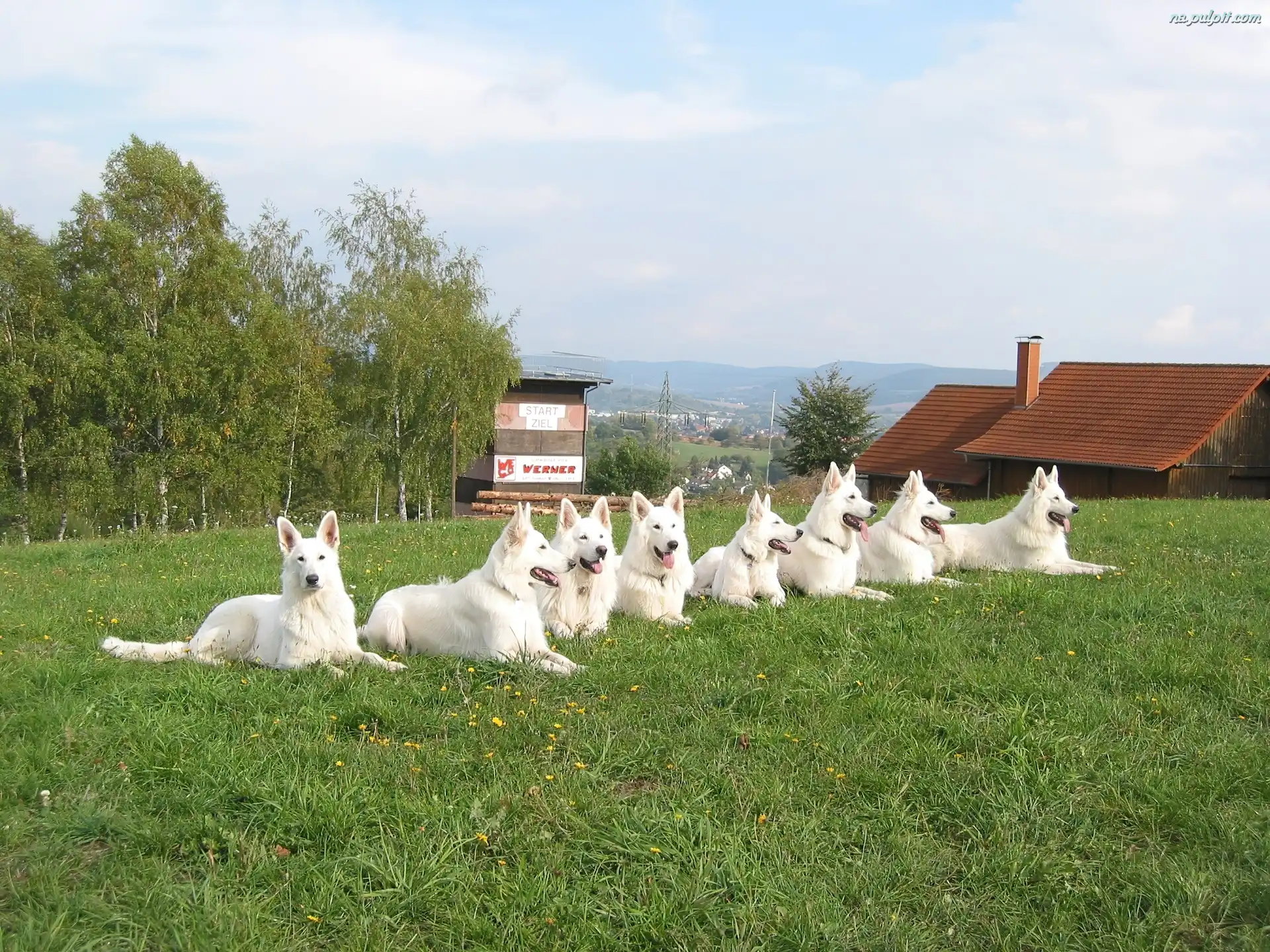 komin, trawa, Białe Owczarki Szwajcarskie, dach