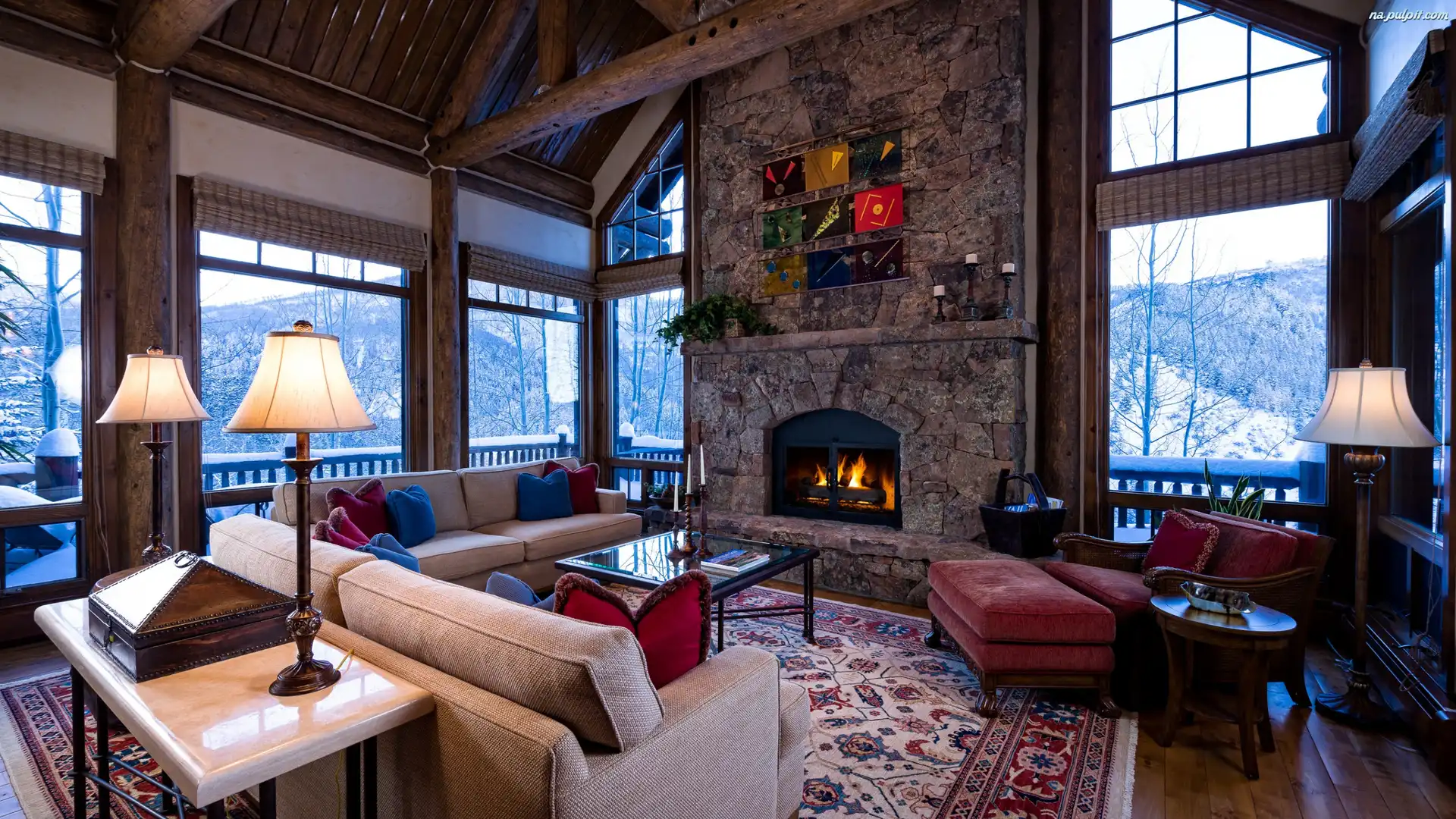 Kominek, Kanapy, Lampy, Duże, Salon, Okna Na Pulpit