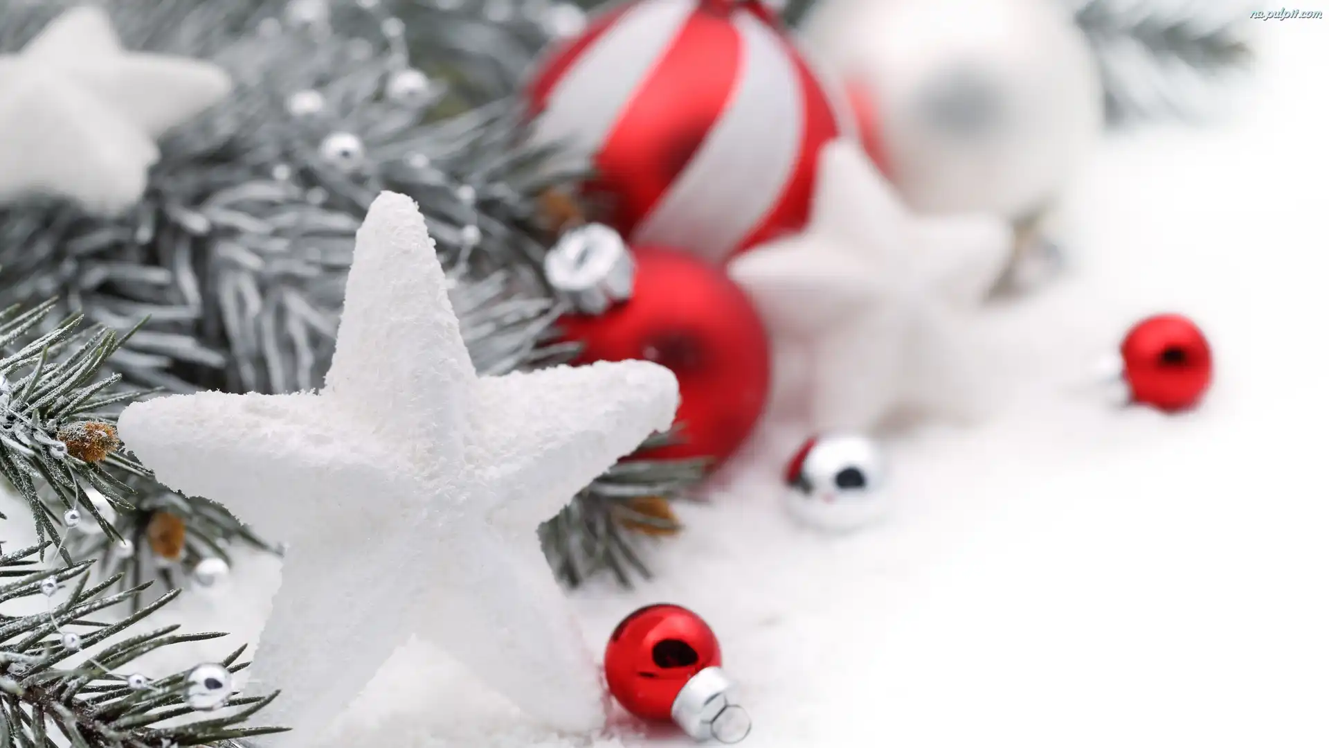 Gałązki, Kompozycja, Śnieg, Gwiazdki, Boże Narodzenie, Świąteczna, Bombki