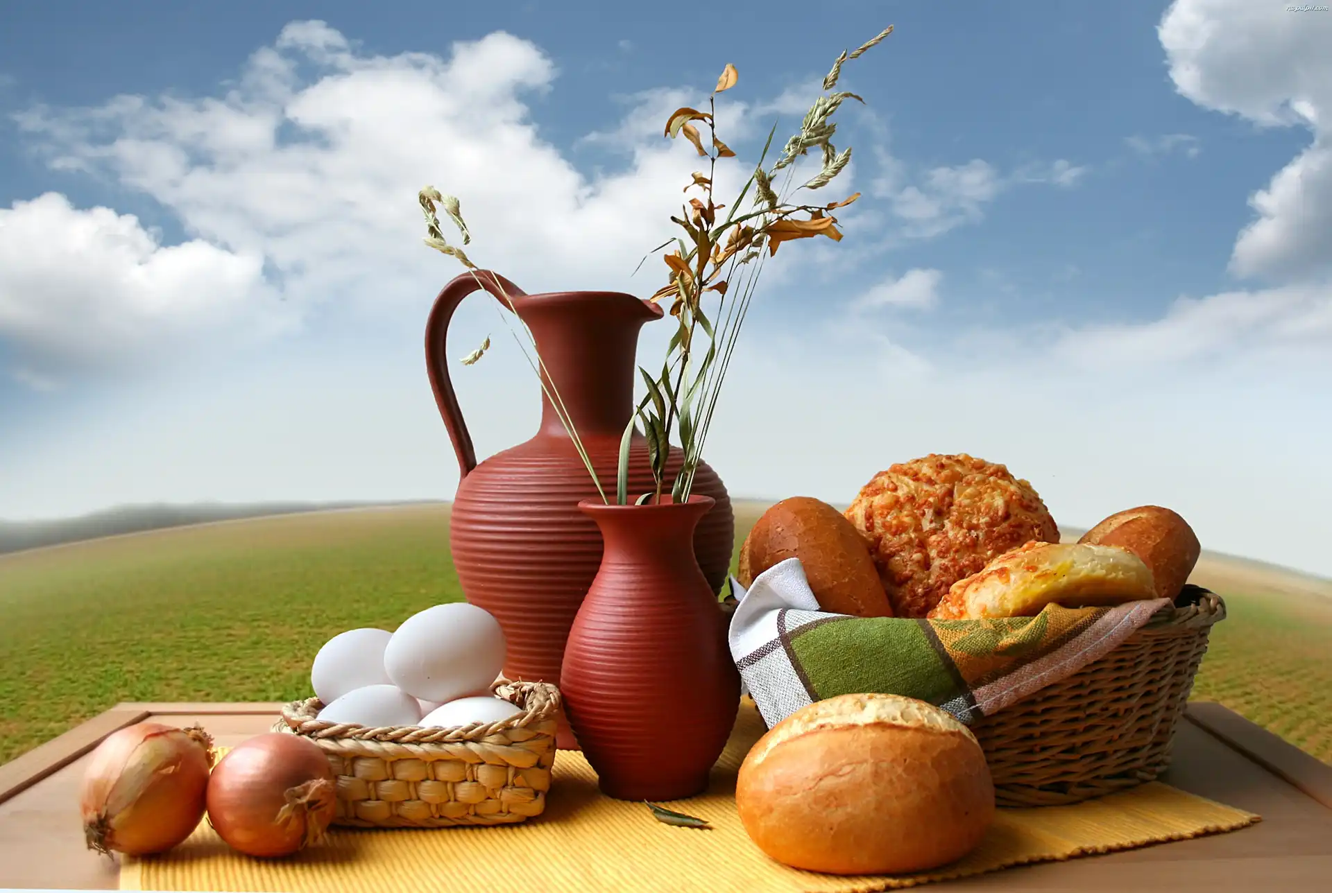 Kompozycja, Cebula, Jajka, Bułki, Tacka