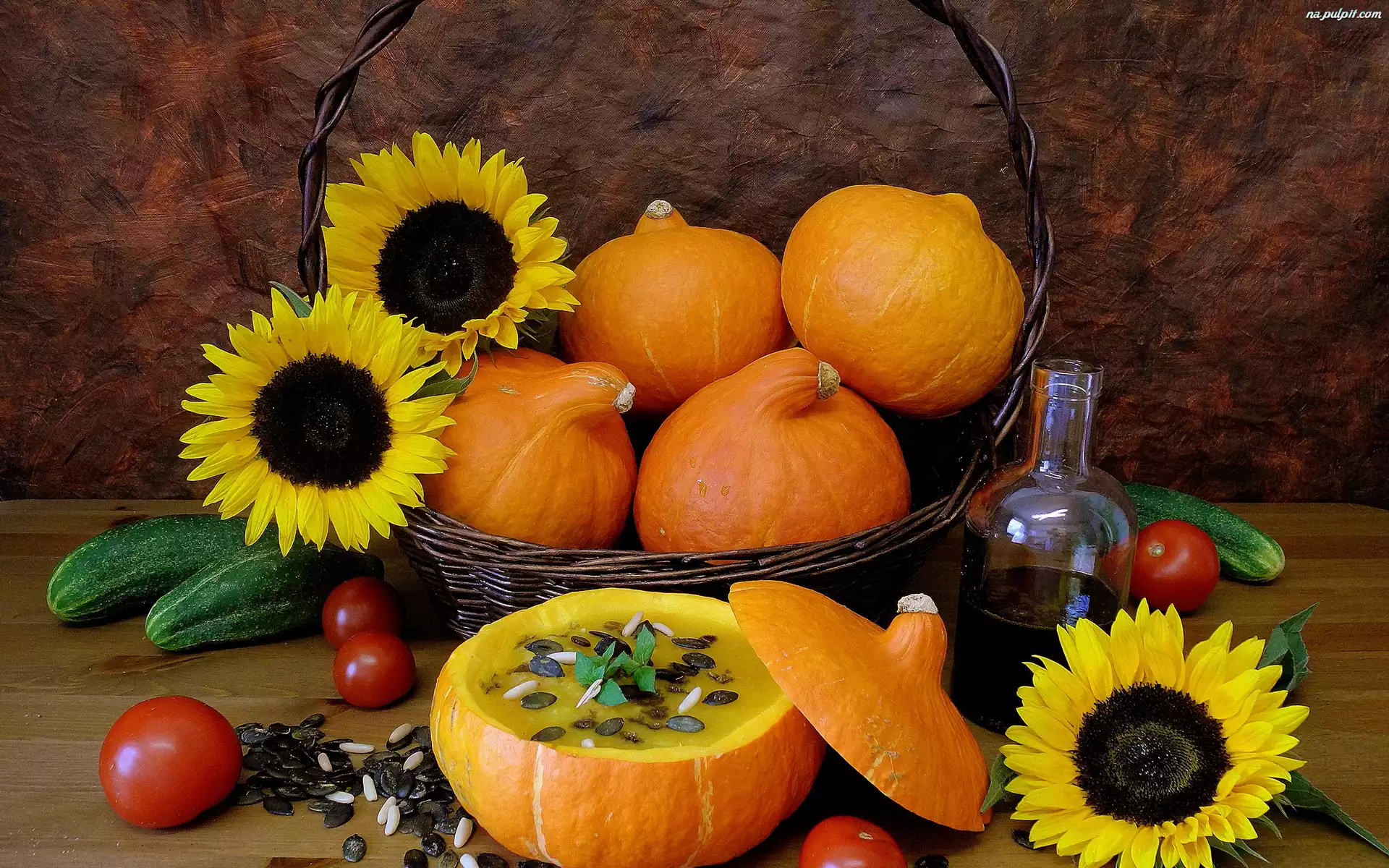 Kompozycja, Warzywa, Słoneczniki, Dynie, Olej Na Pulpit