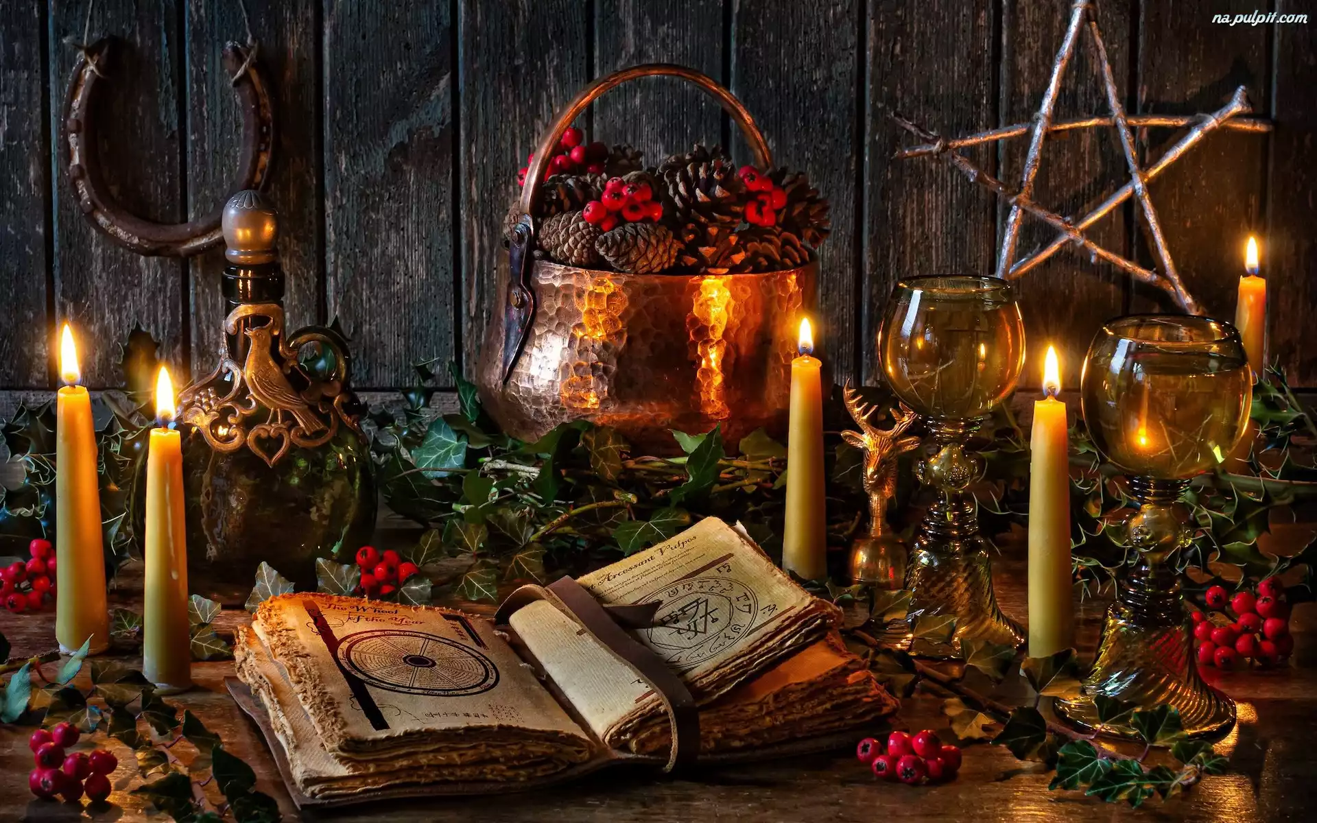 Jagody, Dekoracja, Kieliszki, Kompozycja, Świeca, Książka, Szyszki Na Pulpit